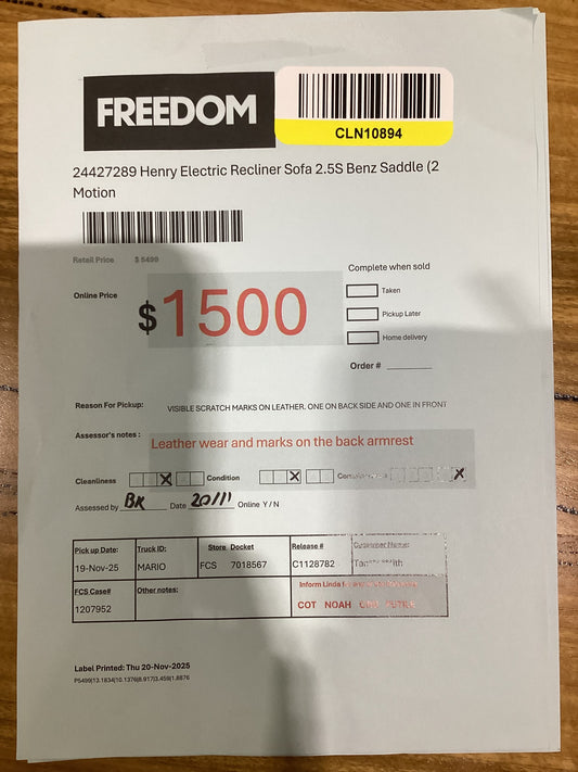 NSW CLN10894 Henry Electric Recliner Sofa 2.5S Benz Saddle