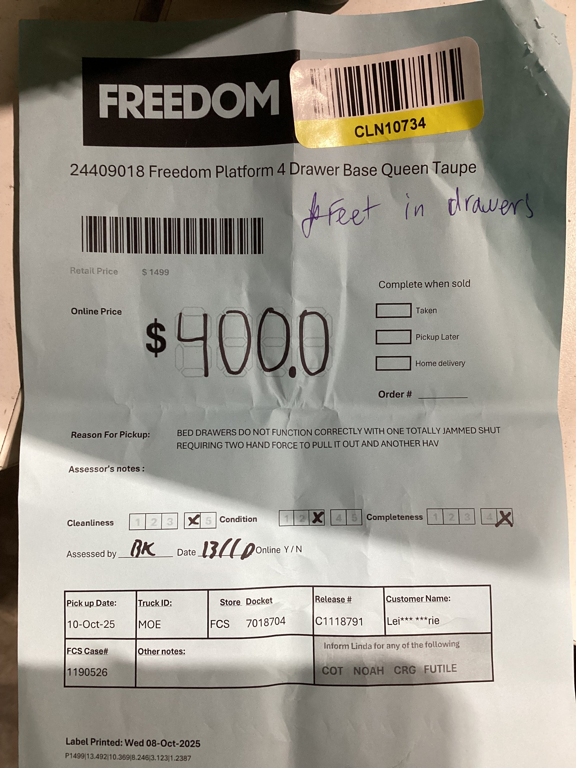 ASSESSOR NOTES: Bed drawers are functional, issue with manufacturing made one side of drawers rails too high causing it to drag along the edge of base and the other having a gap at top of drawer