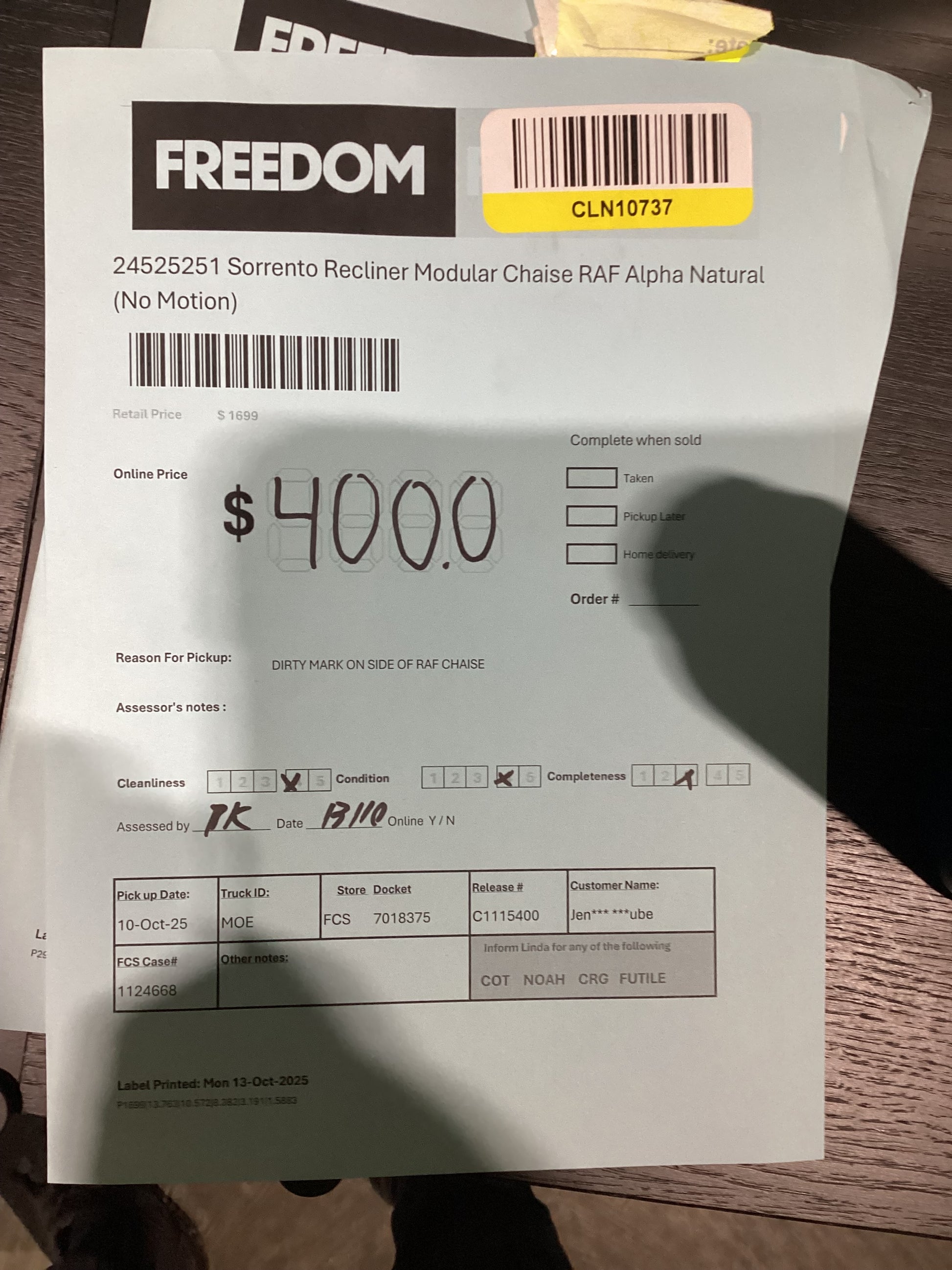RETURN REASON:Â Dirty mark on side of RAF Chaise