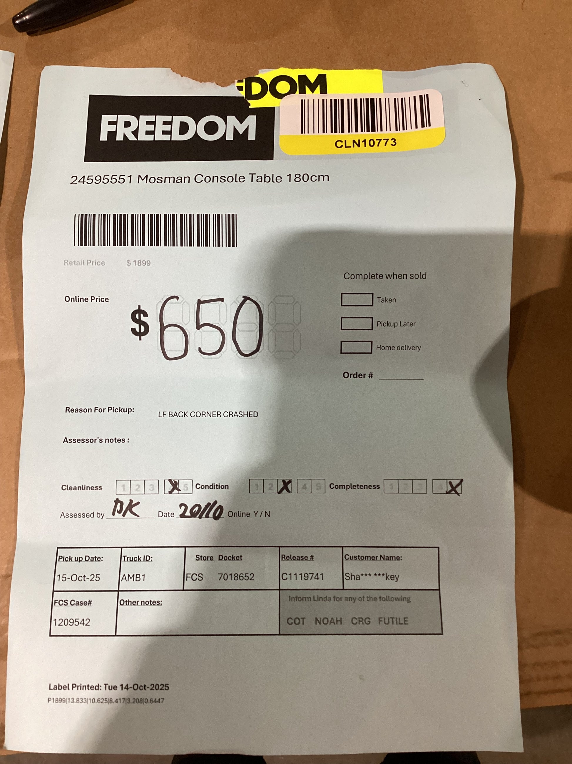 ASSESSOR NOTES: LF Back corner is crushedÂ