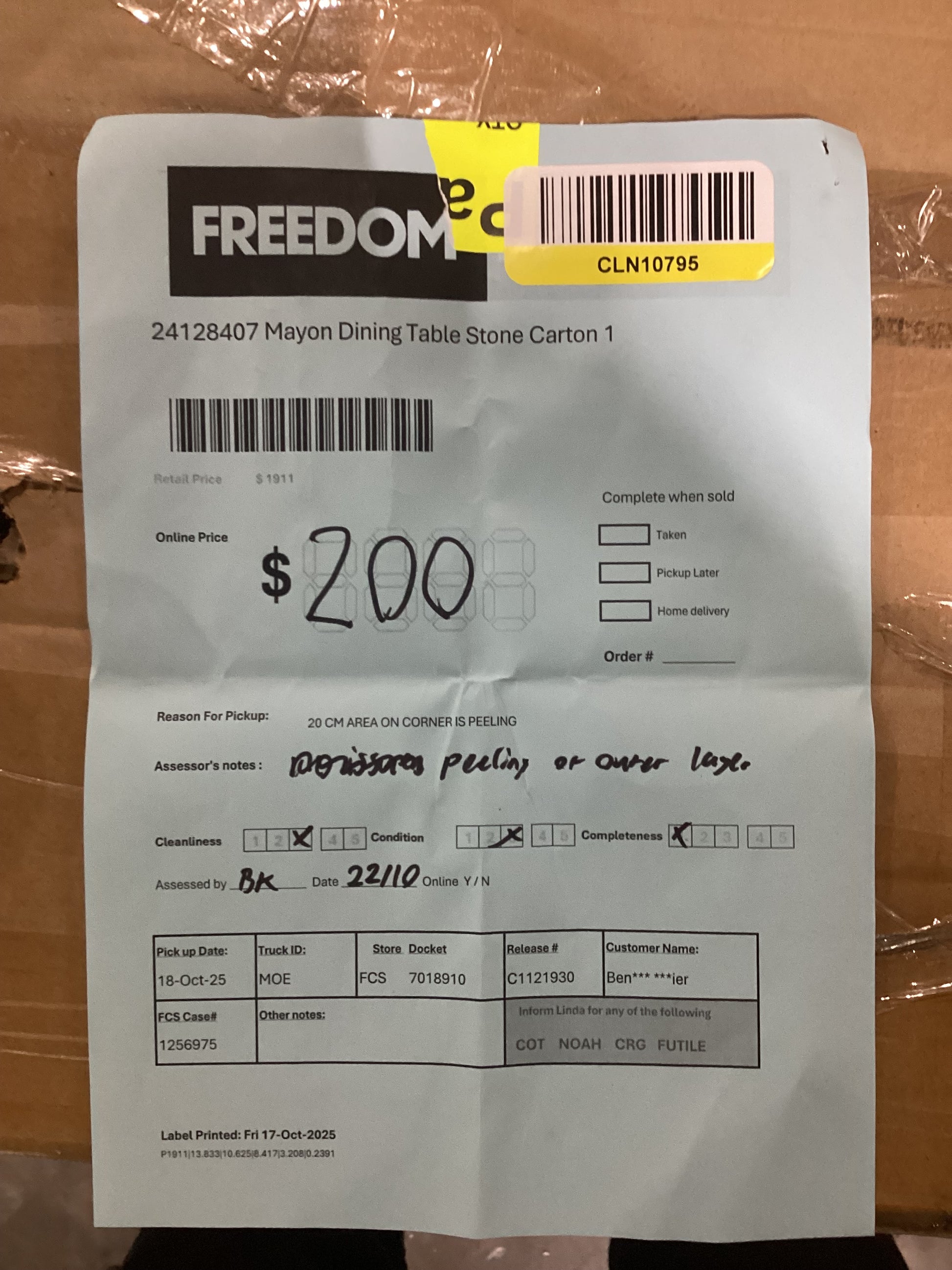 ASSESSOR NOTES: Peeling on outer layer by corner