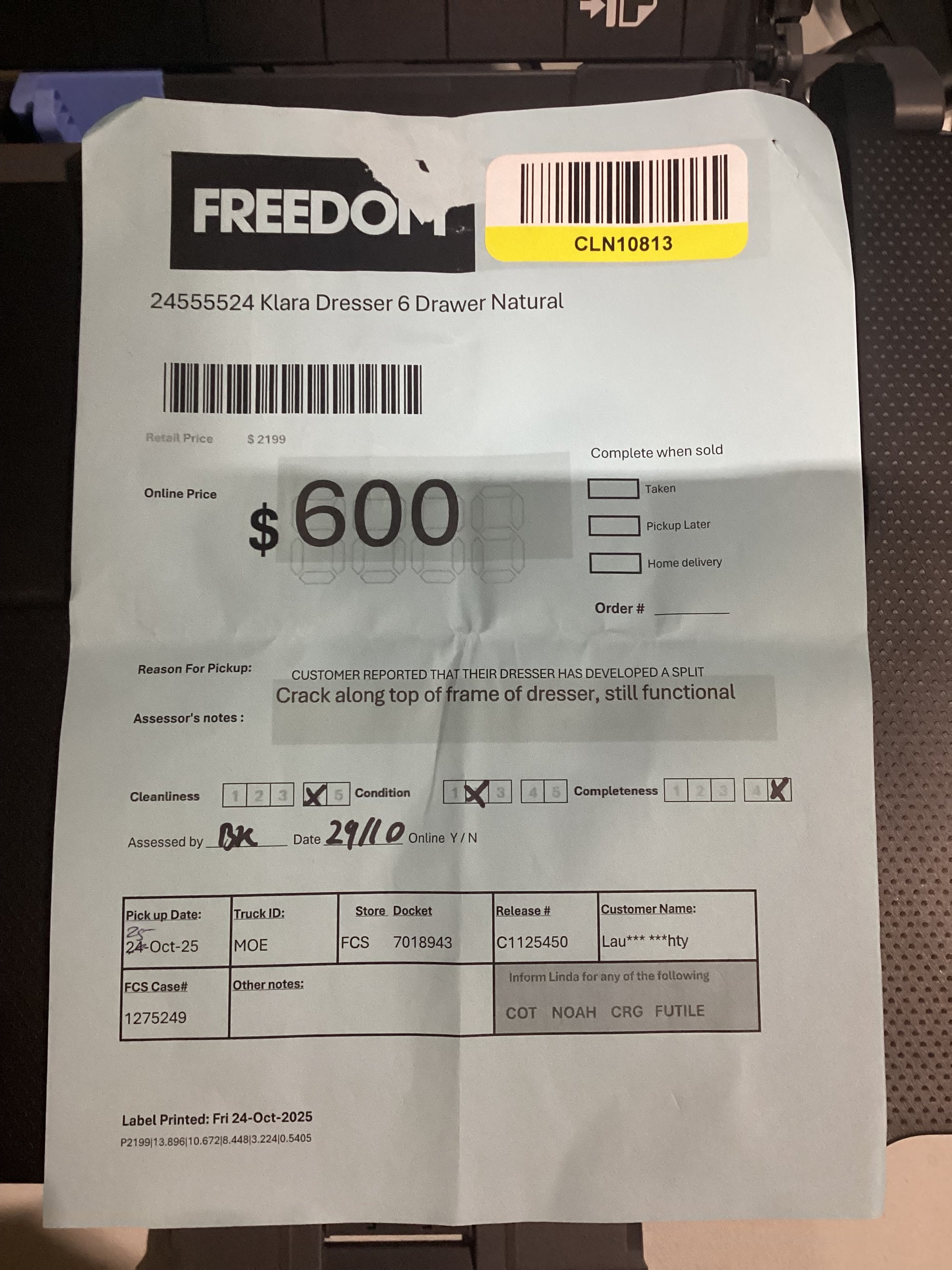 RETURN REASON:Â Customer reported that their dresser has developed a split