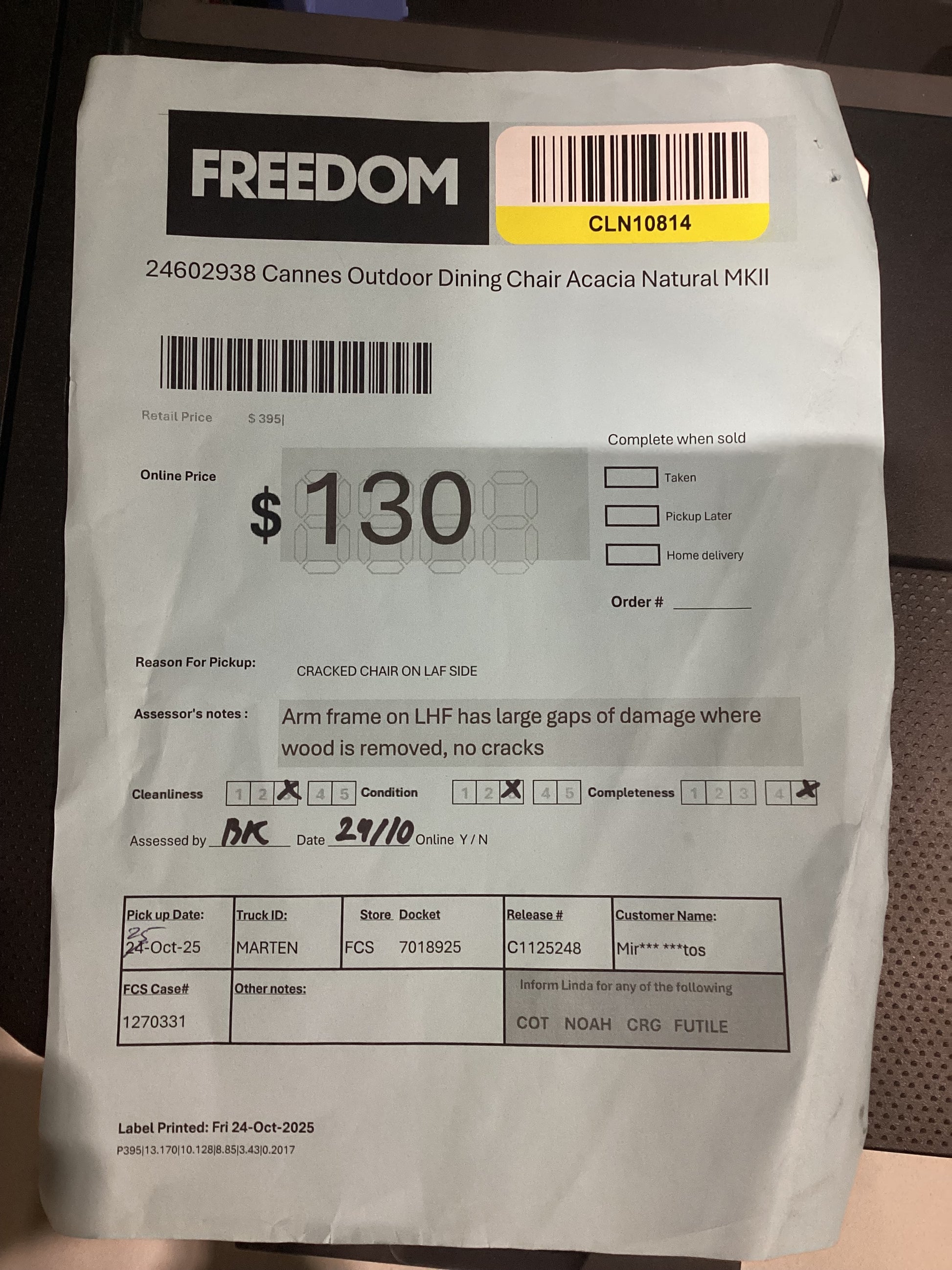 RETURN REASON:Â Crack chair on LAF Side