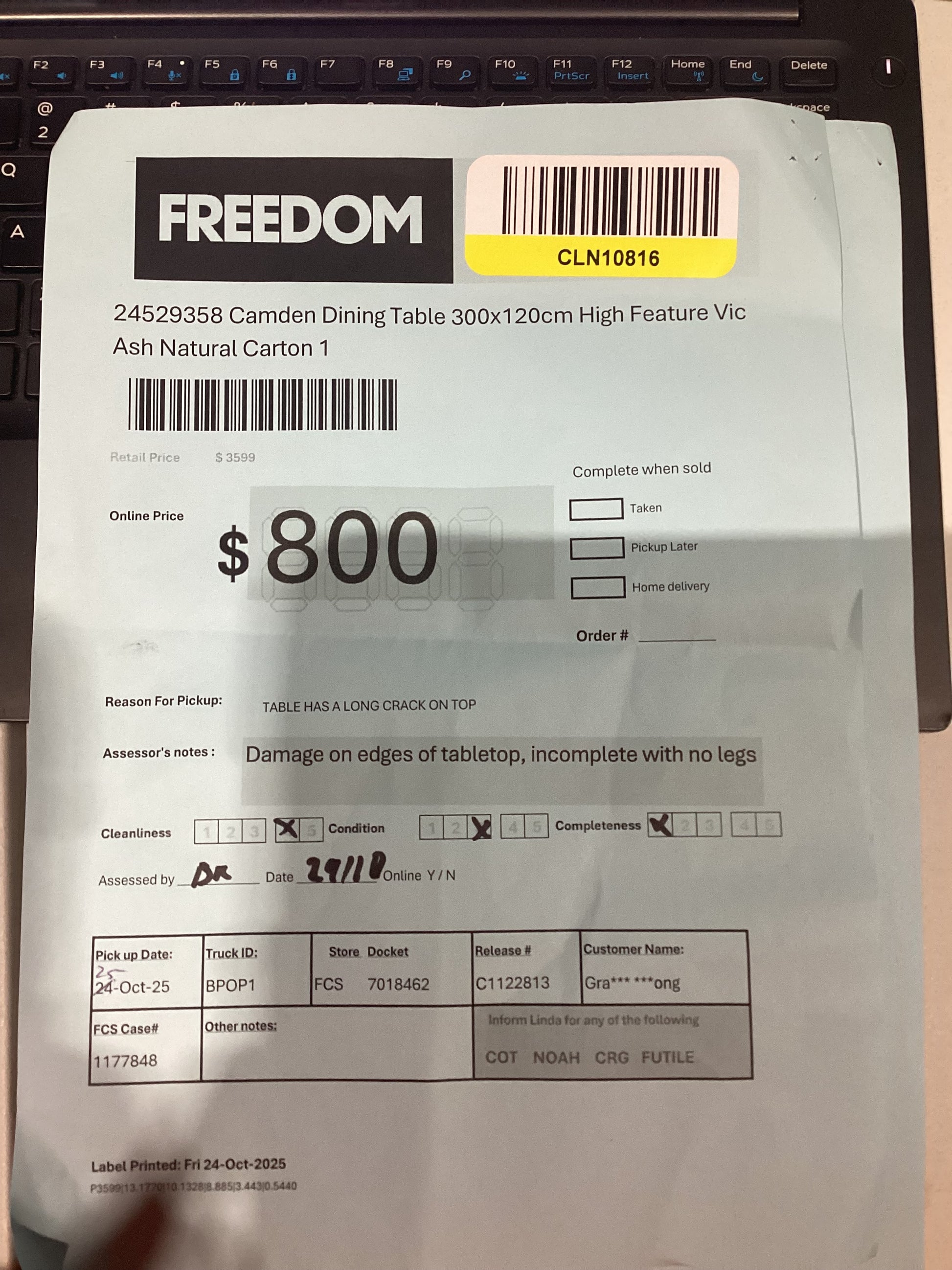 ASSESSOR NOTES: Damages on edges of tabletop, incomplete with no legs