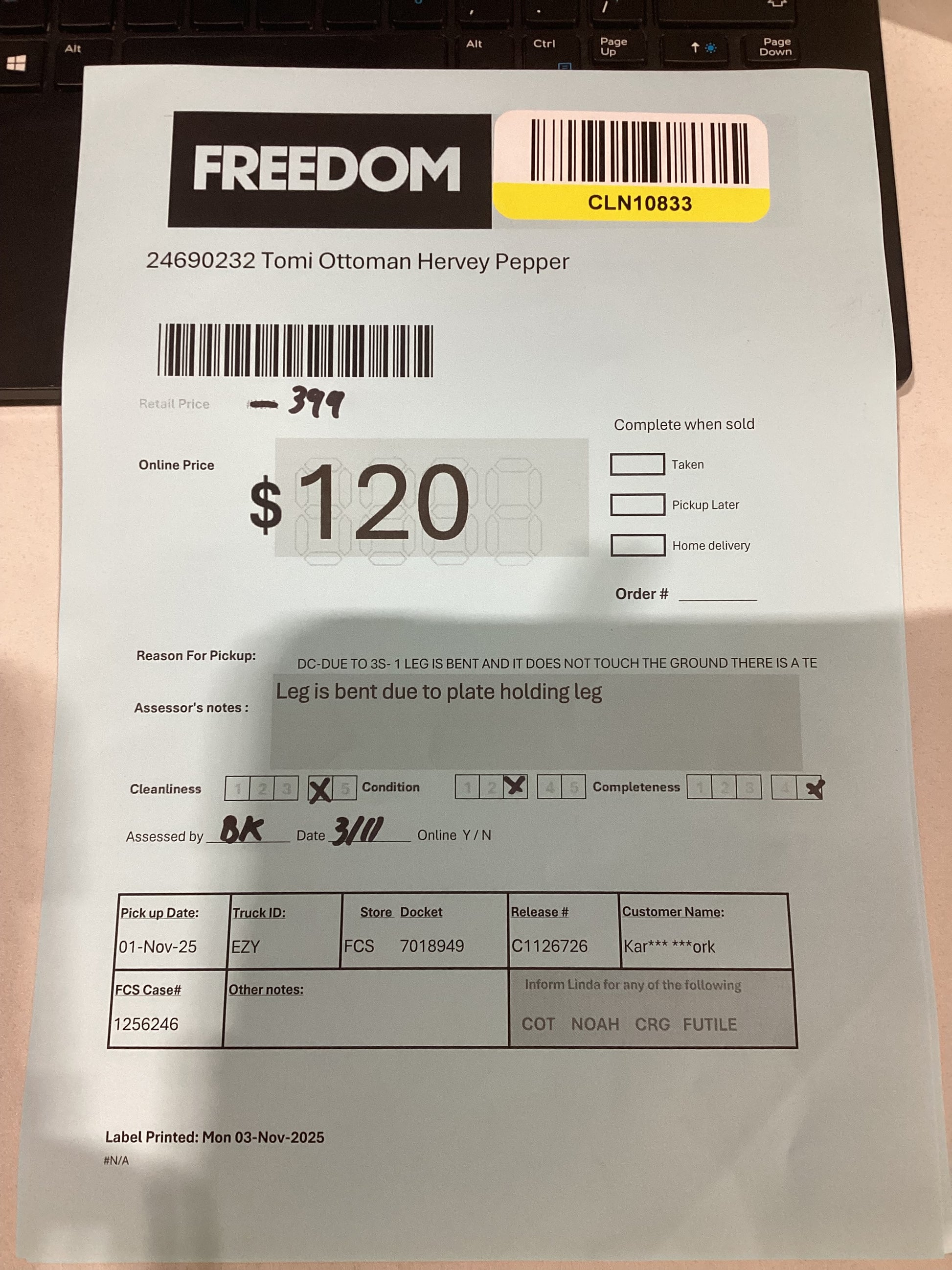 ASSESSOR NOTES: Leg is bent due to plate holding leg