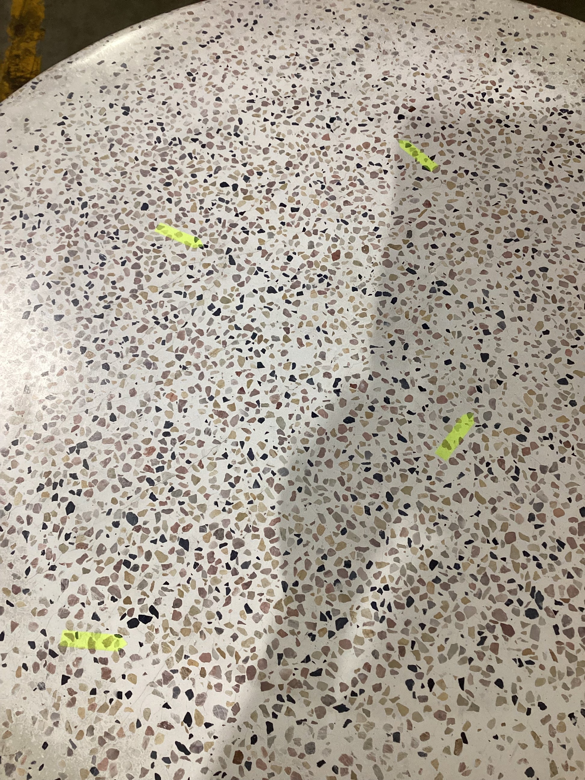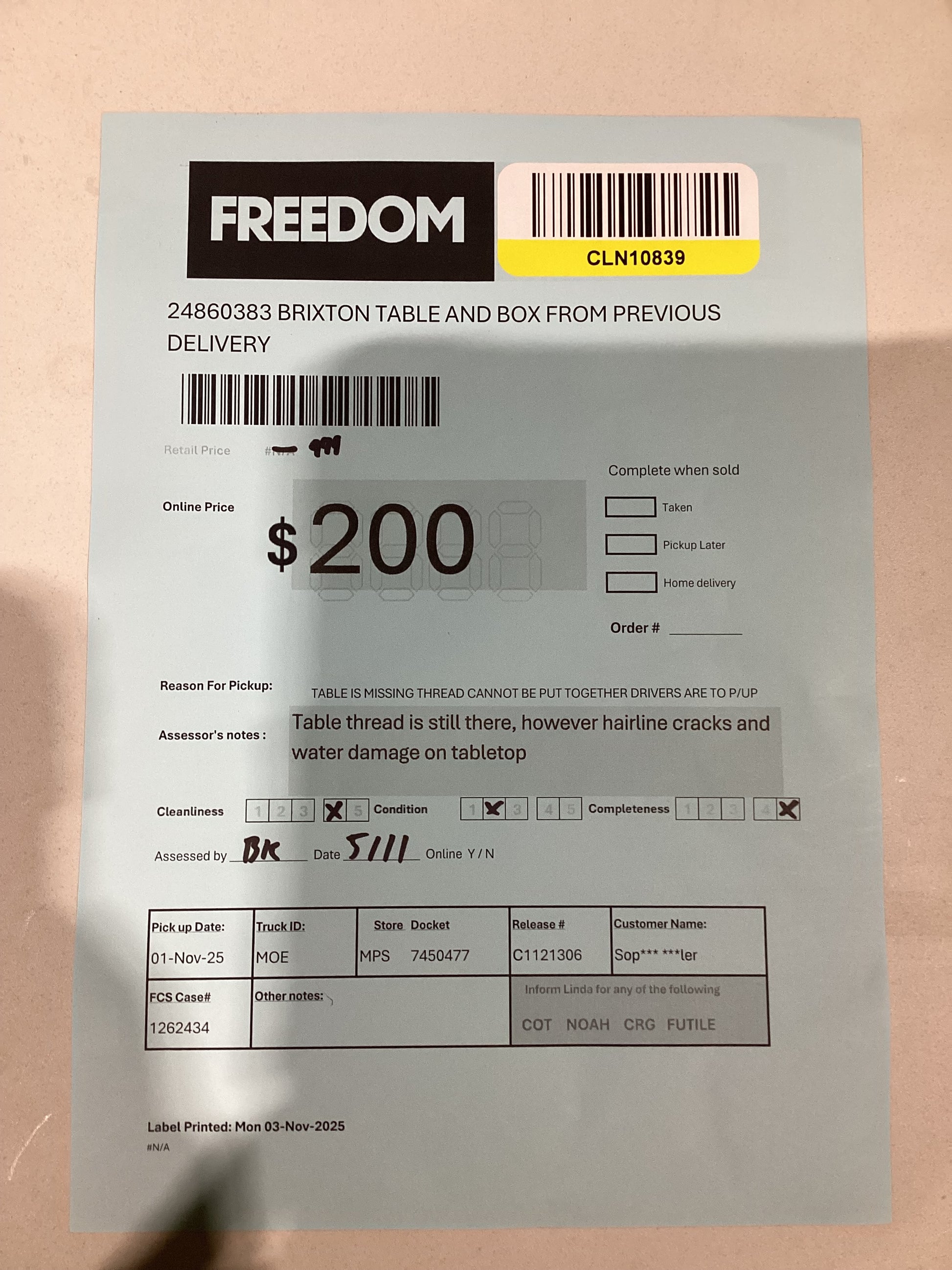 ASSESSOR NOTES: Table thread is still there, however hairline cracks and water damage on tabletop