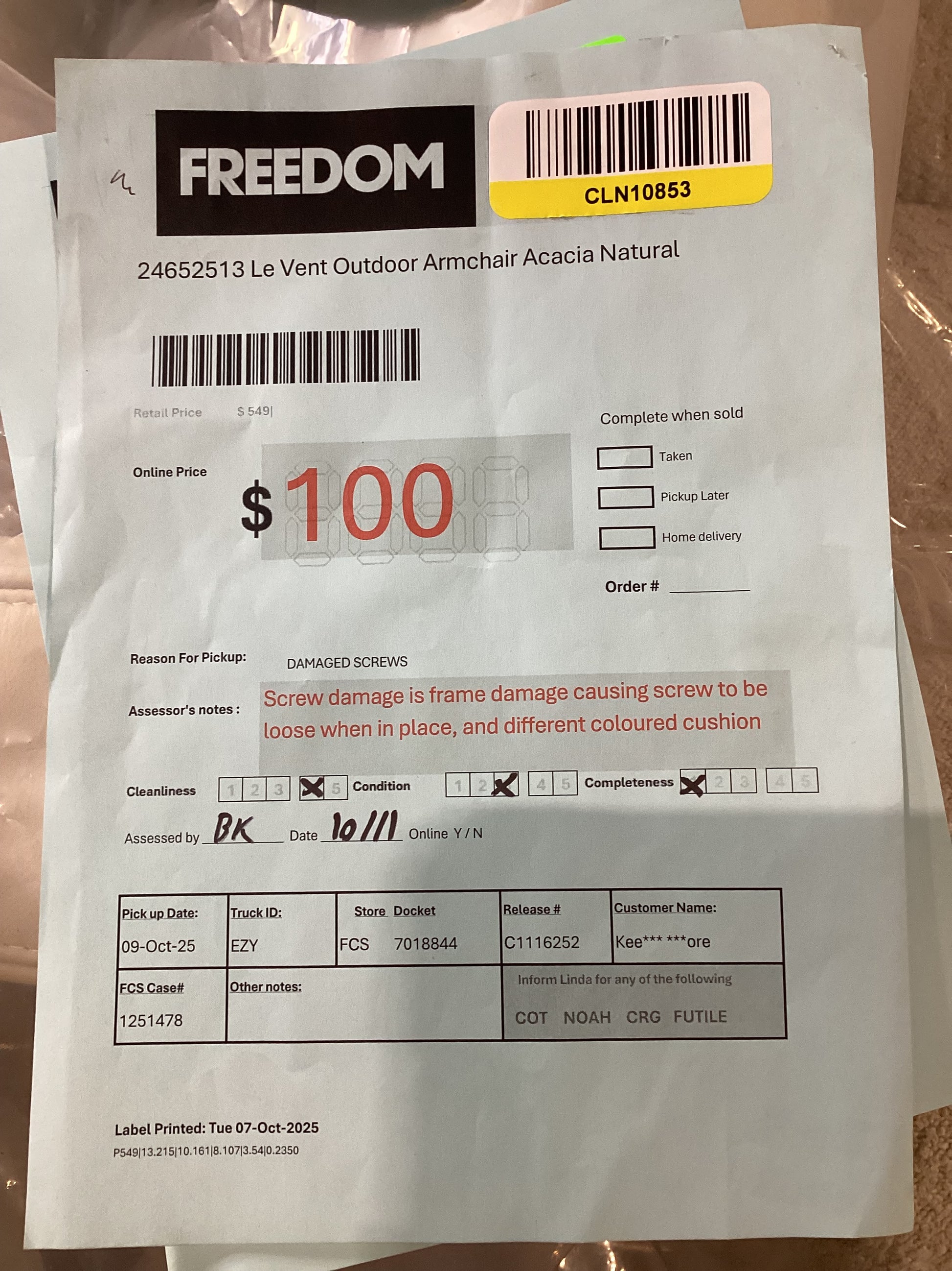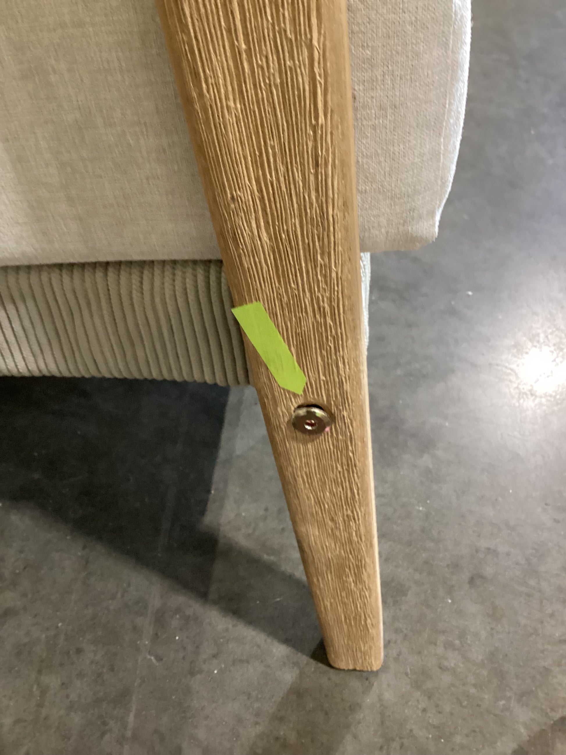 ASSESSOR NOTES:Screw damage is frame damage and causing screw to be loose when in place, and different coloured cushion