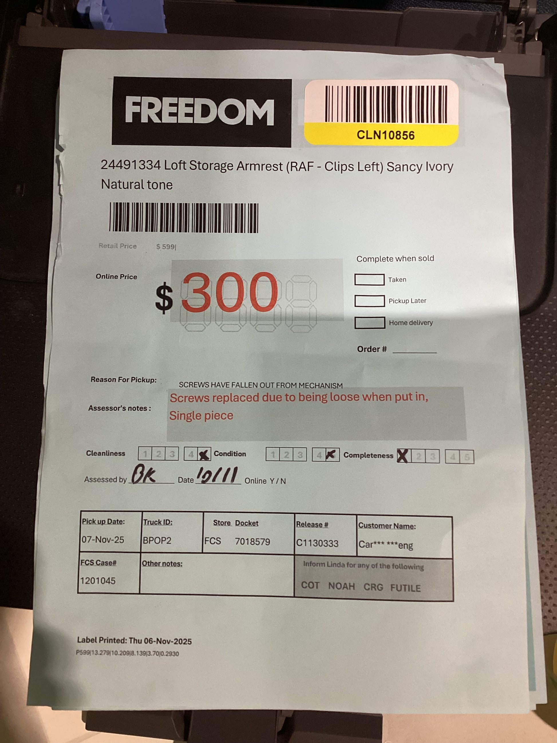 ASSESSOR NOTES: Screws replaced due to being loose when put in, singular piece