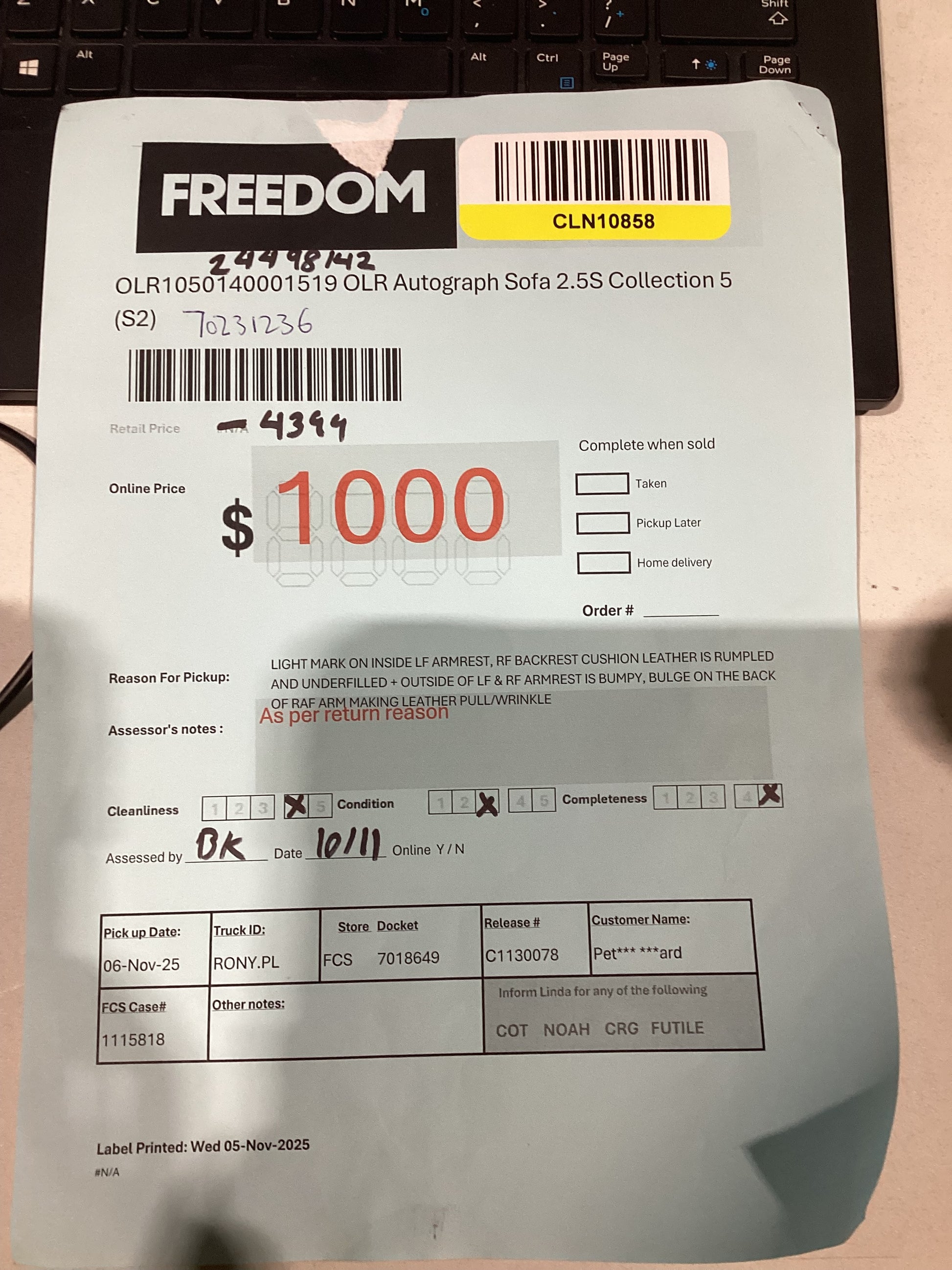 RETURN REASON:Â Light mark on inside LF armrest, RF backrest cushion and leather is rumpled and underfilled and outside of LF and RF Armrest is bumpy, buldge on the back of RAF Arm