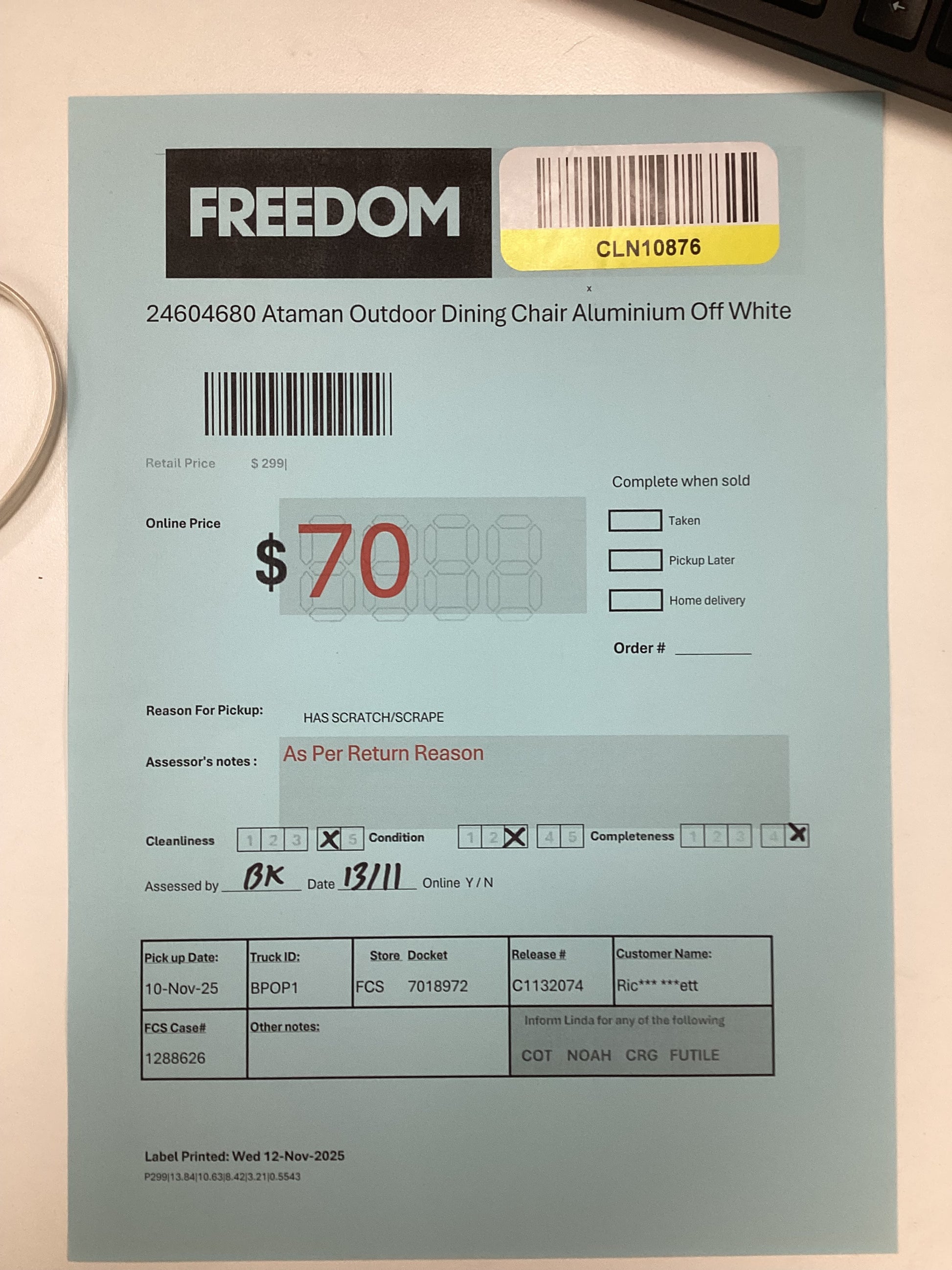 ASSESSOR NOTES: As Per return reason, occuring on backrest