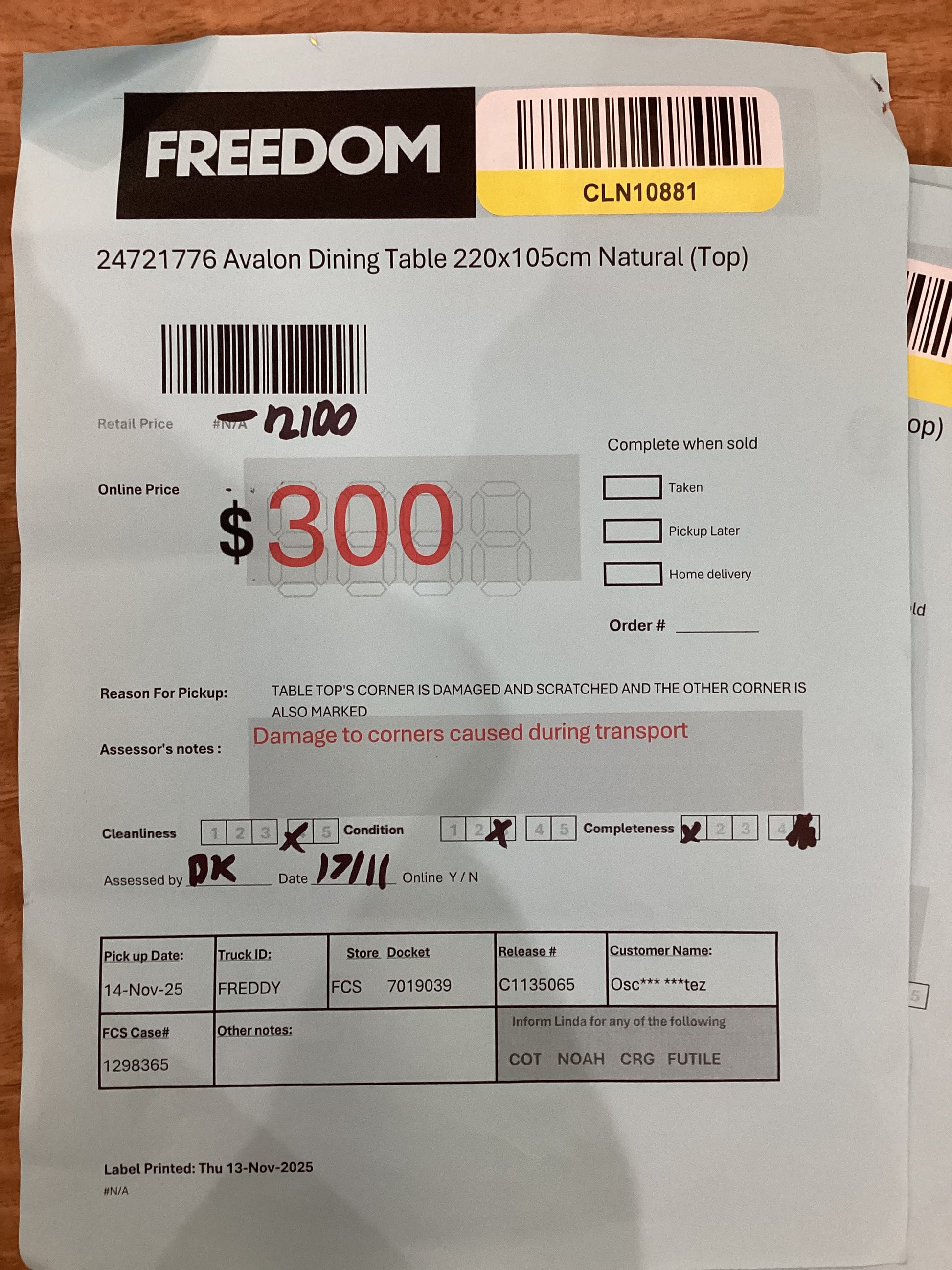 RETURN REASON:Â Tabletops corner is damaged and scratched and the other corner is also marked