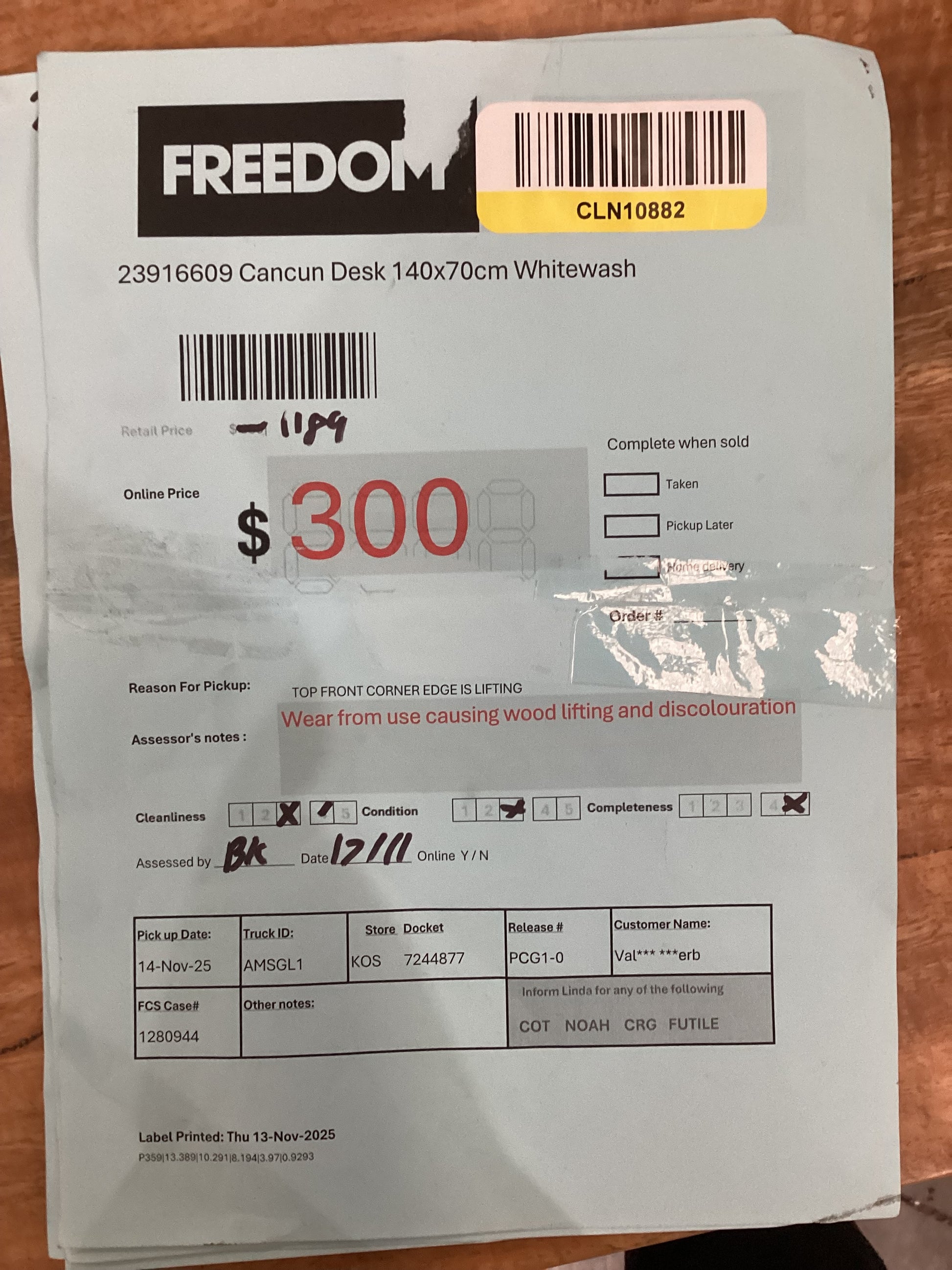 ASSESSOR NOTES: Wear from use causing wood lifting and discolouration