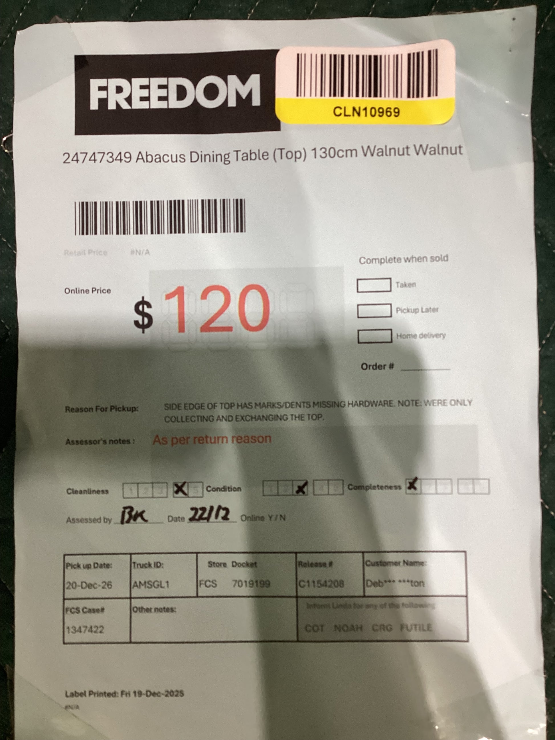 RETURN REASON: Â Side Edge of top has marks/dents missing hardware