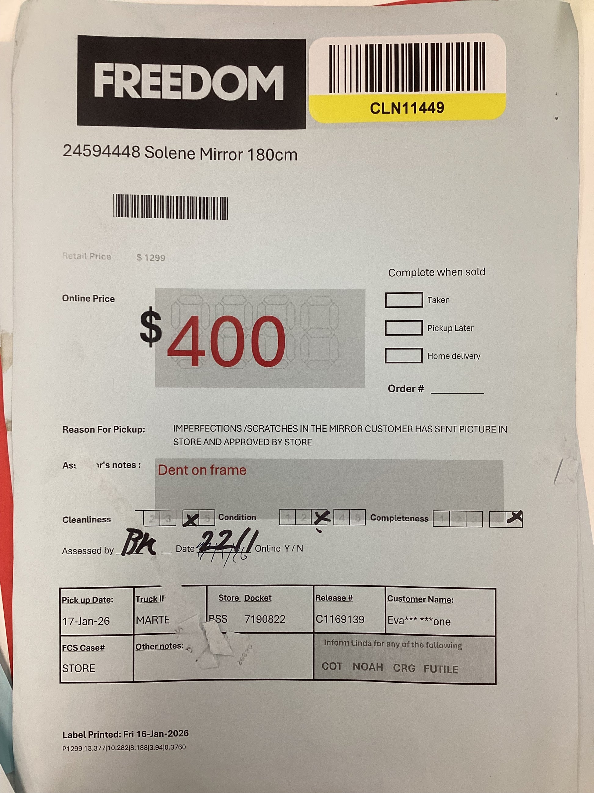 RETURN REASON:Â Imperfections/scratches in the mirror
