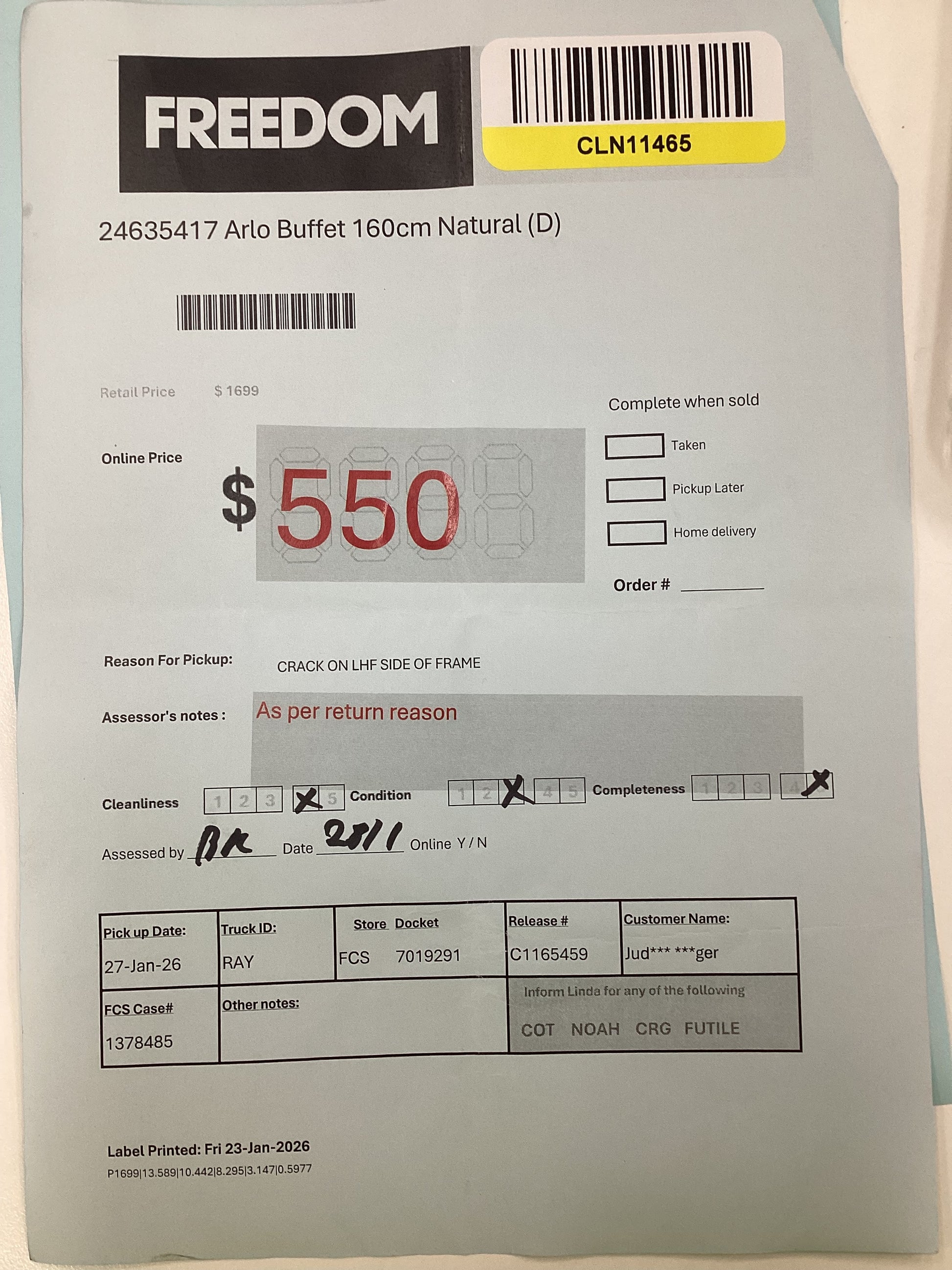 RETURN REASON:Â Crack on LHF side of frame
