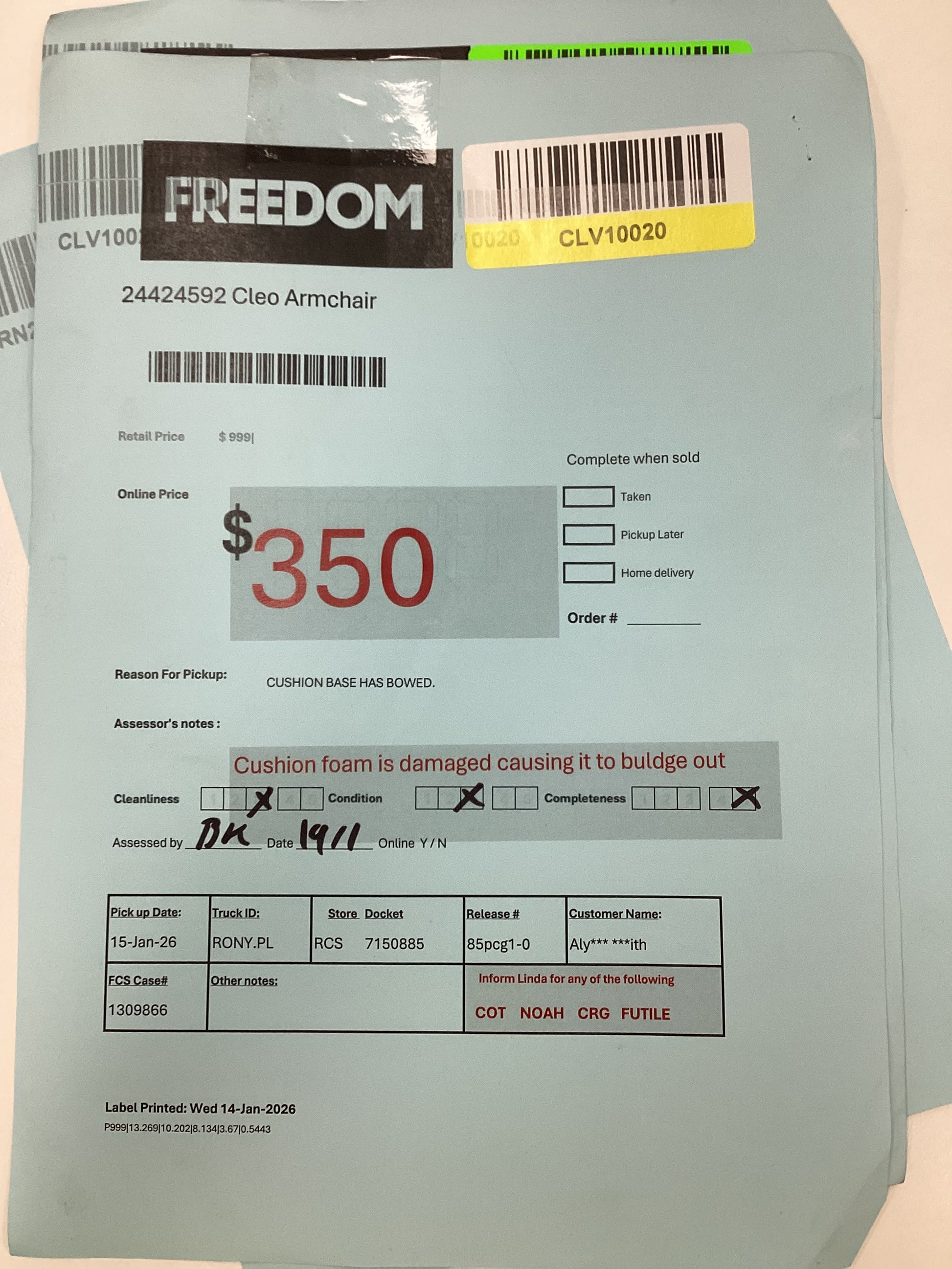 ASSESSOR NOTES: Cushion Foam is Damaged causing it to buldge out