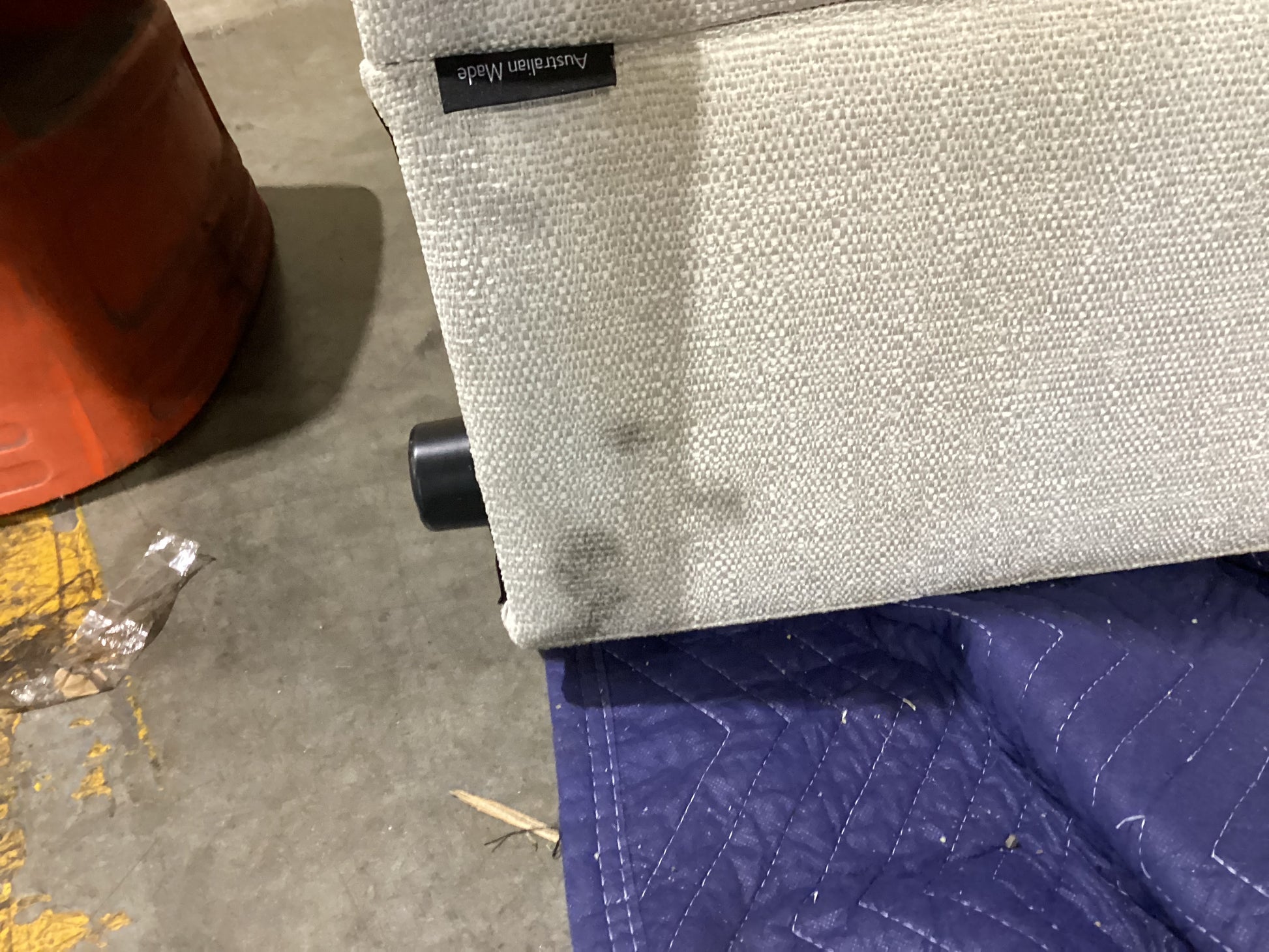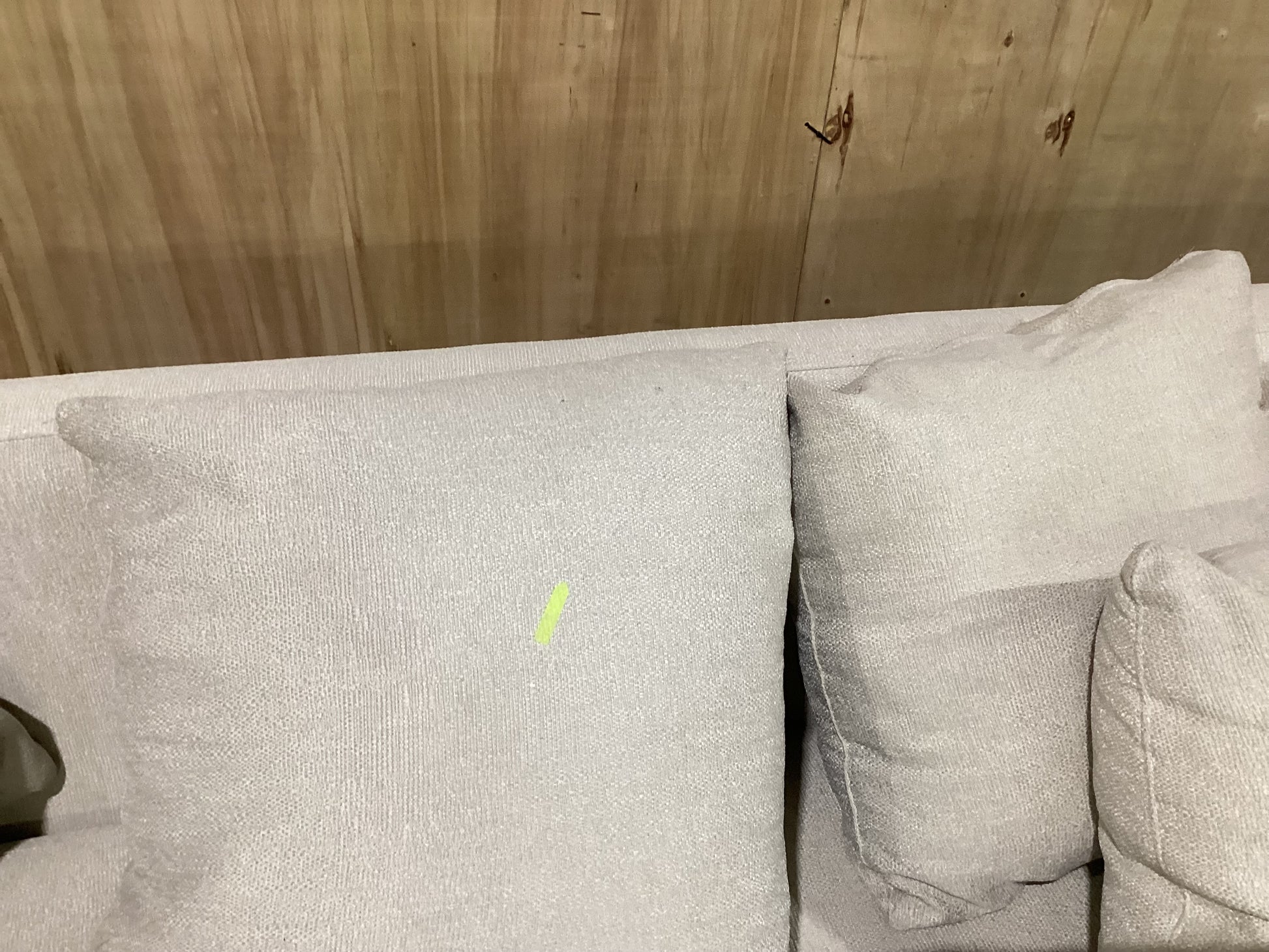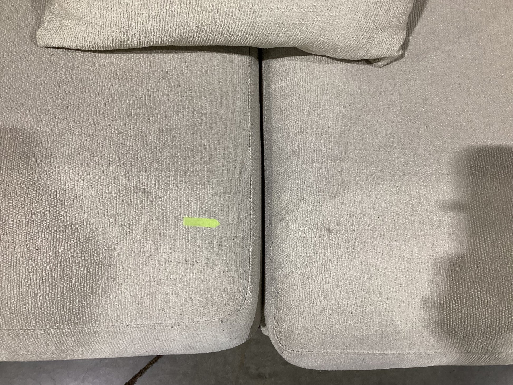 ASSESSOR NOTES: Marks and pilling on sofa, with fabric being isssue on seams and a damaged footÂ