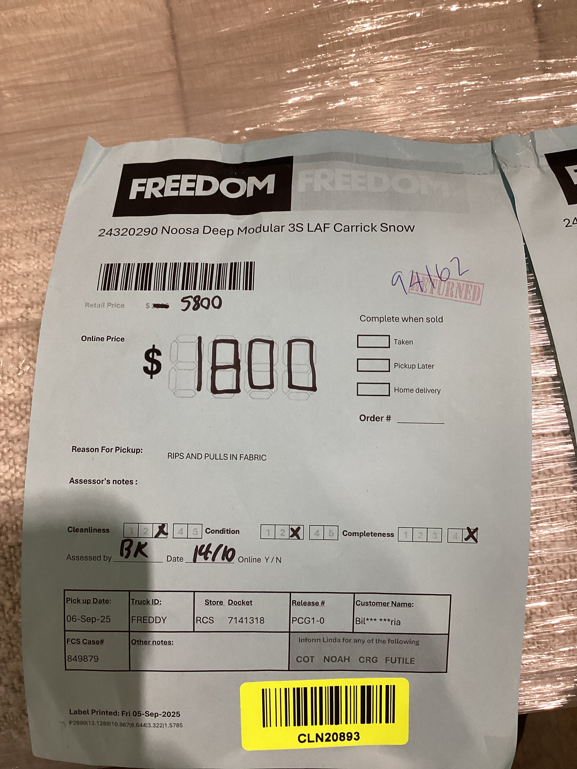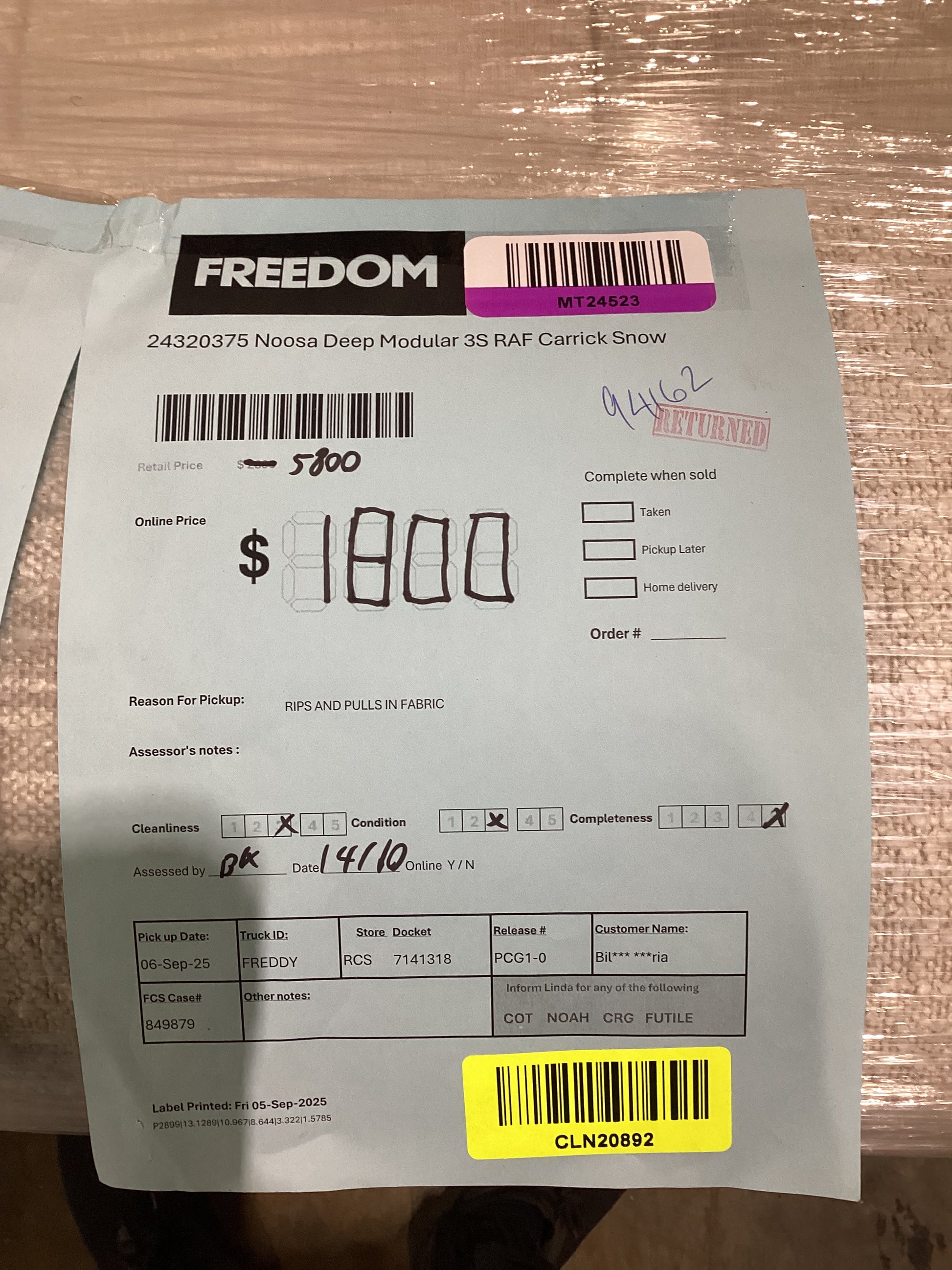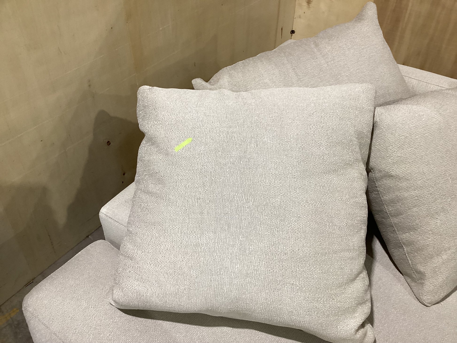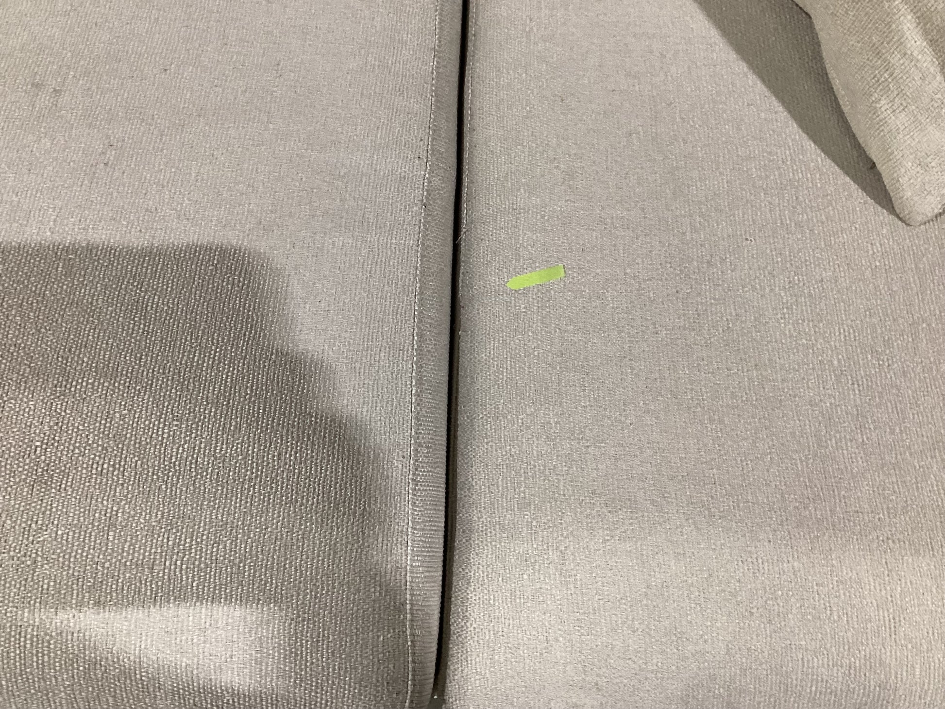 ASSESSOR NOTES: Marks and pilling on sofa, with fabric being isssue on seams and a damaged footÂ