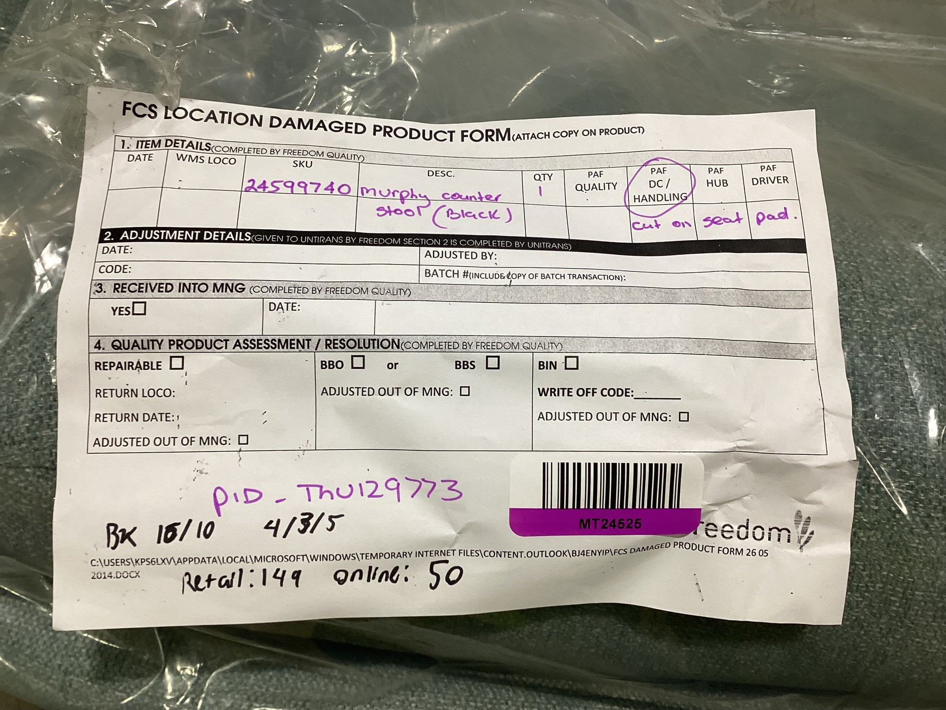 RETURN REASON:Â Damaged in warehouse (Cut on Seat)