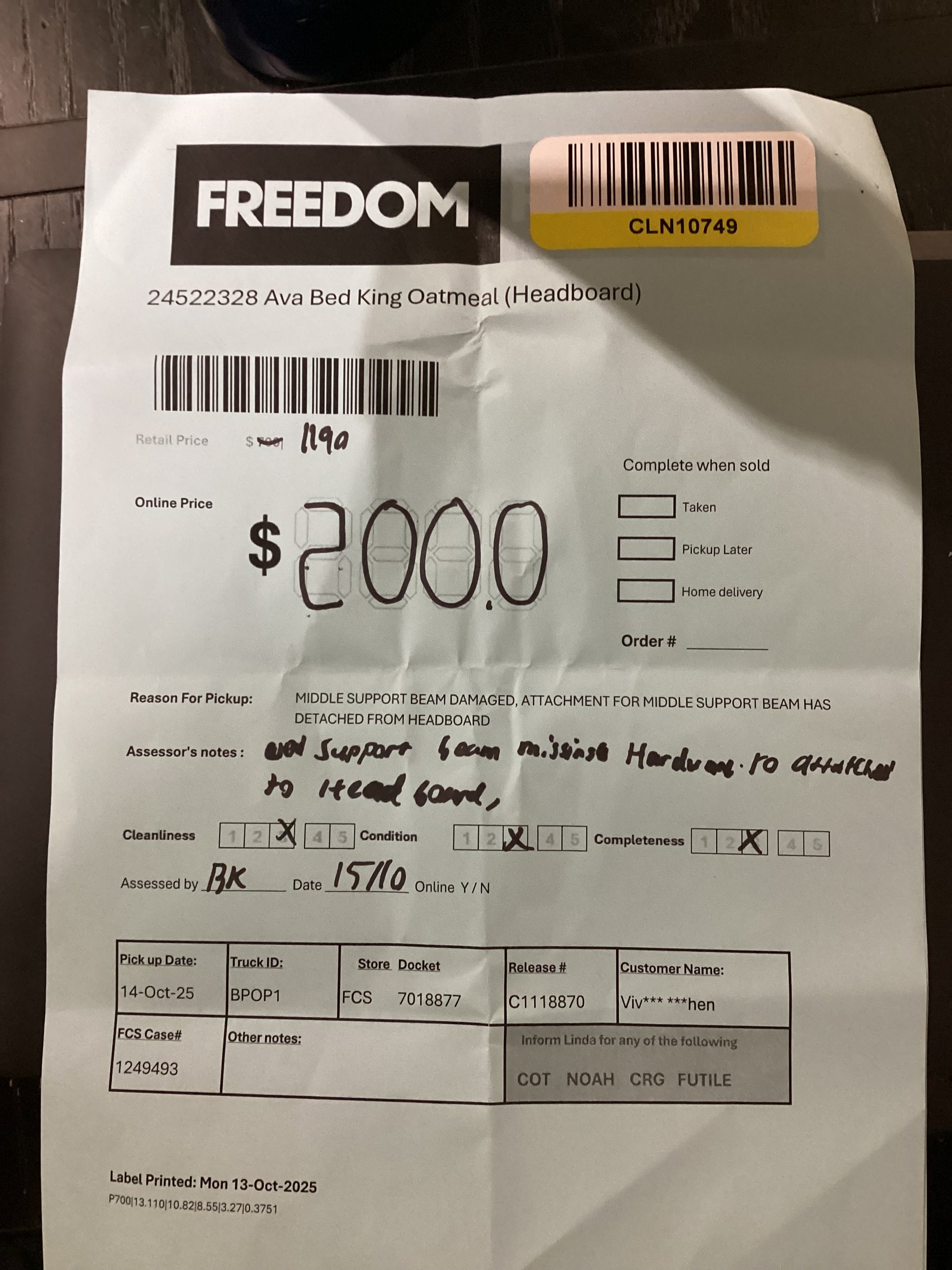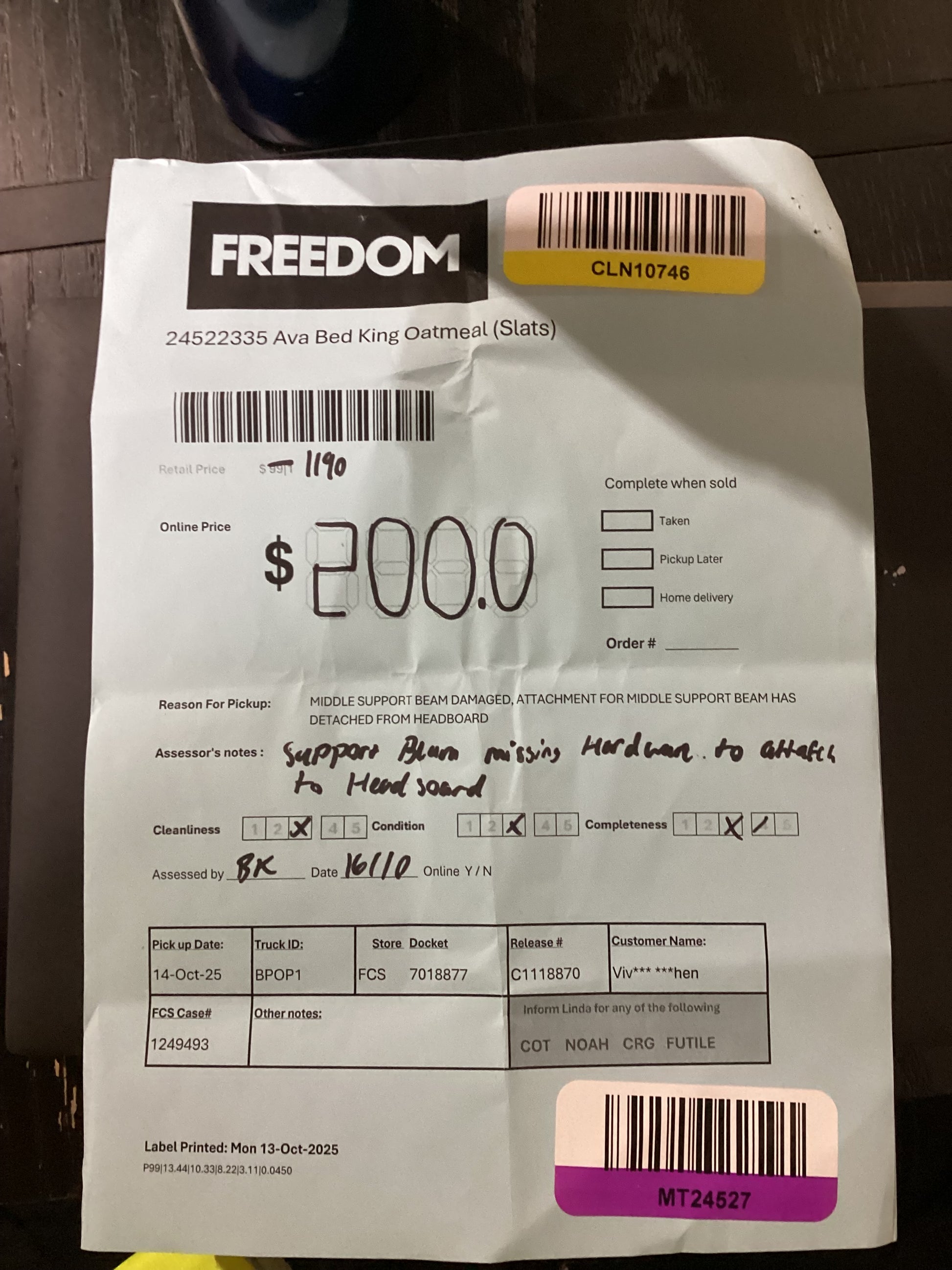 RETURN REASON:Â Middle support beam damaged and attachment to headboard has detached