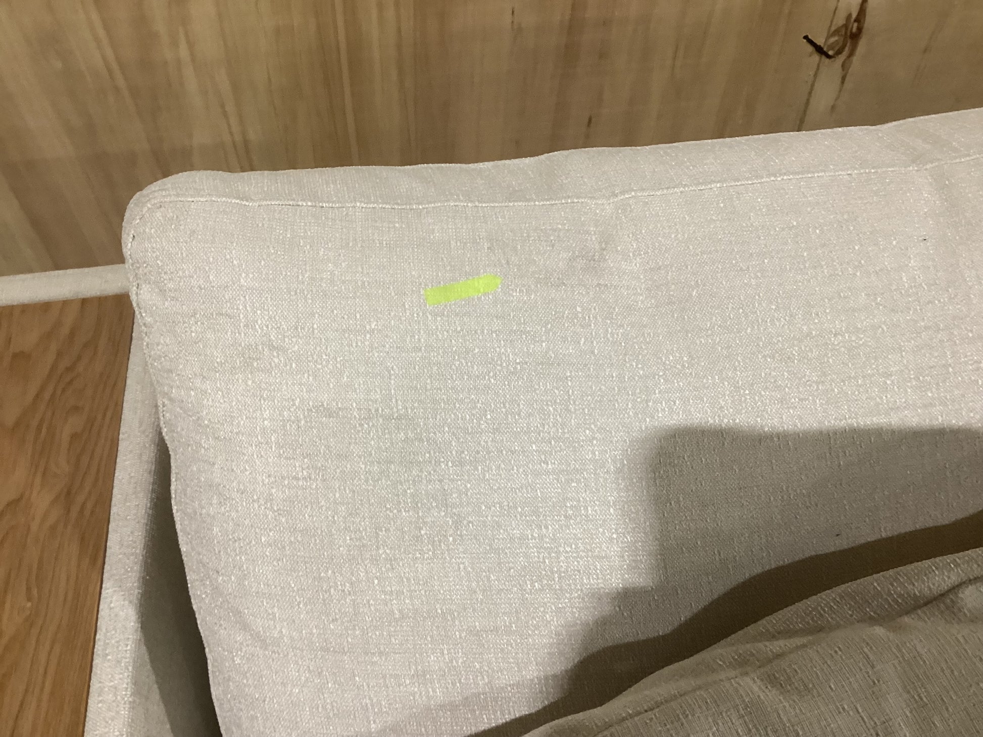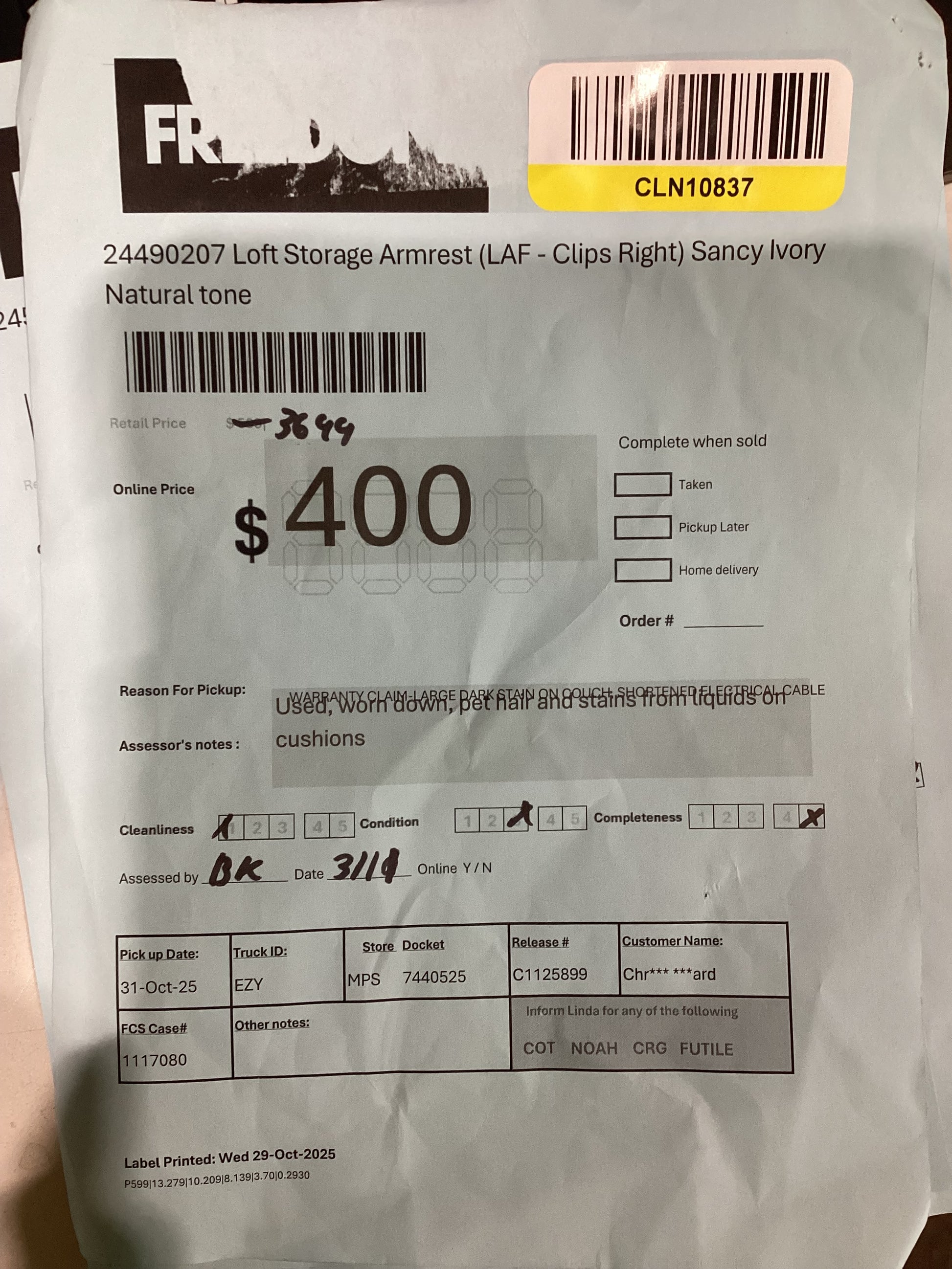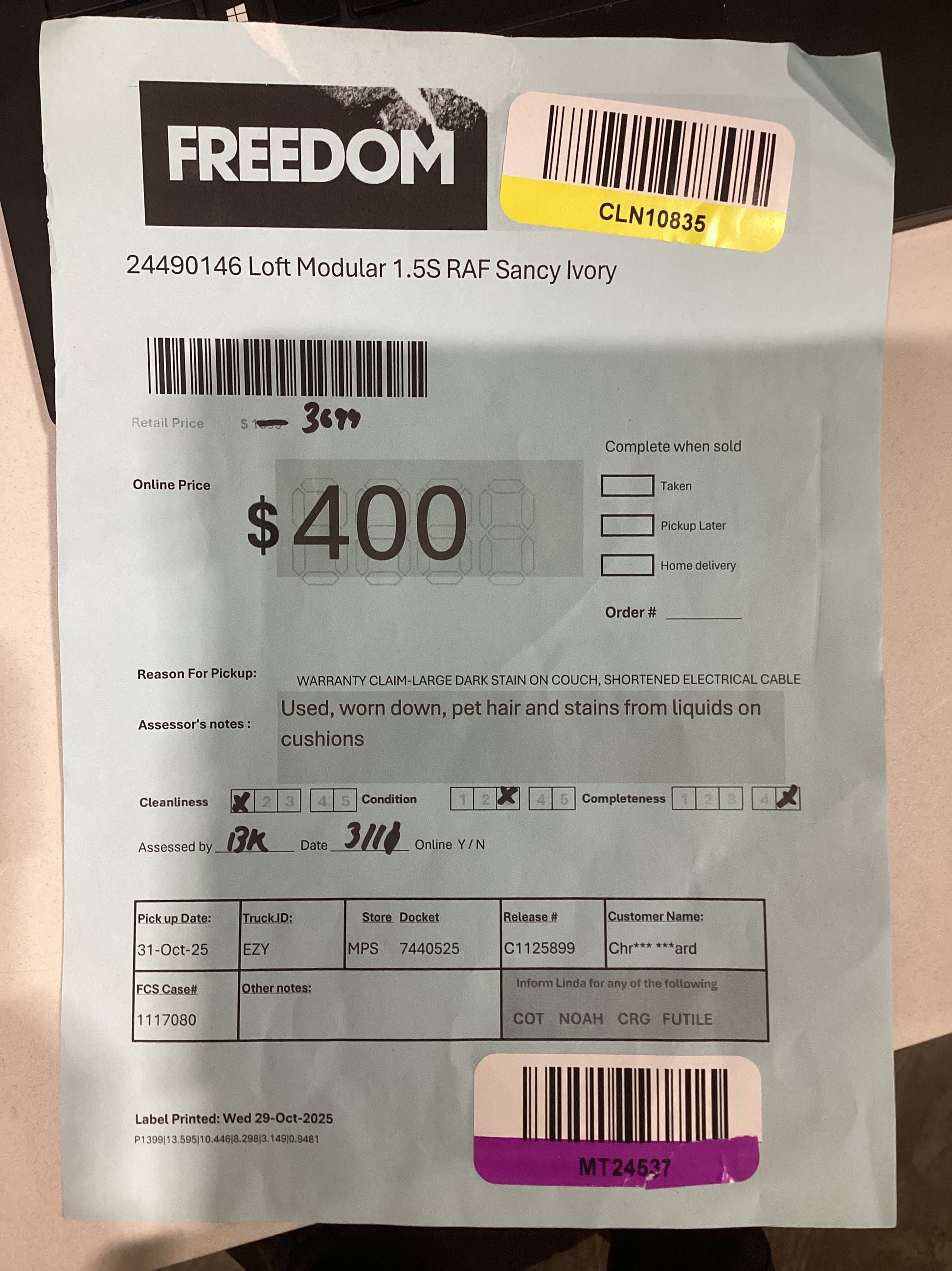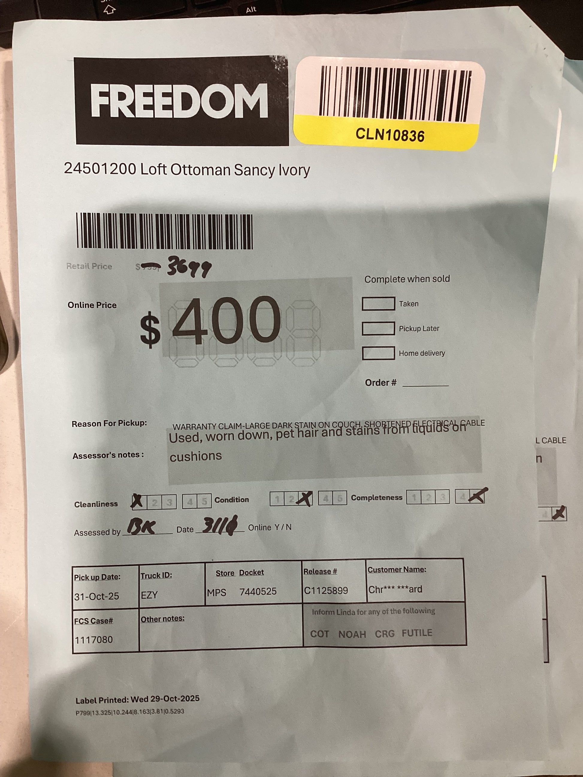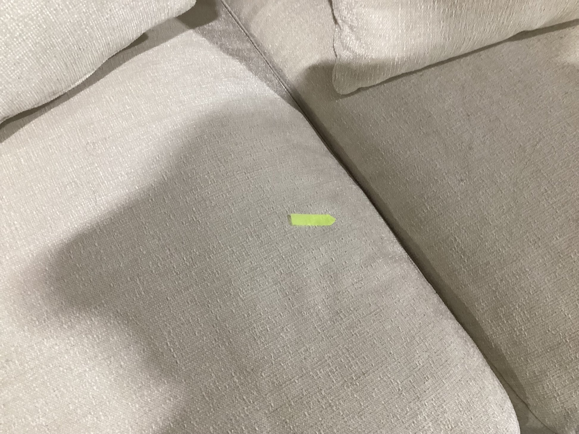 RETURN REASON: Warranty claim- large dark stain on couch, shortened electrical cable