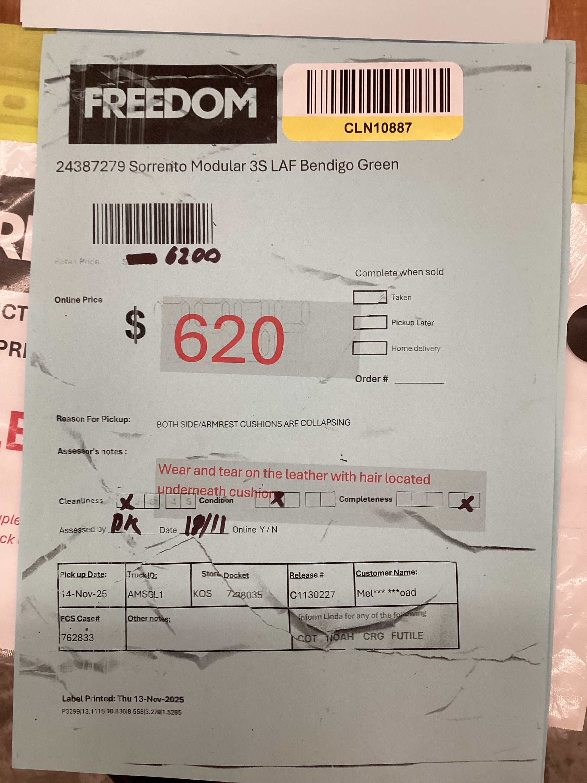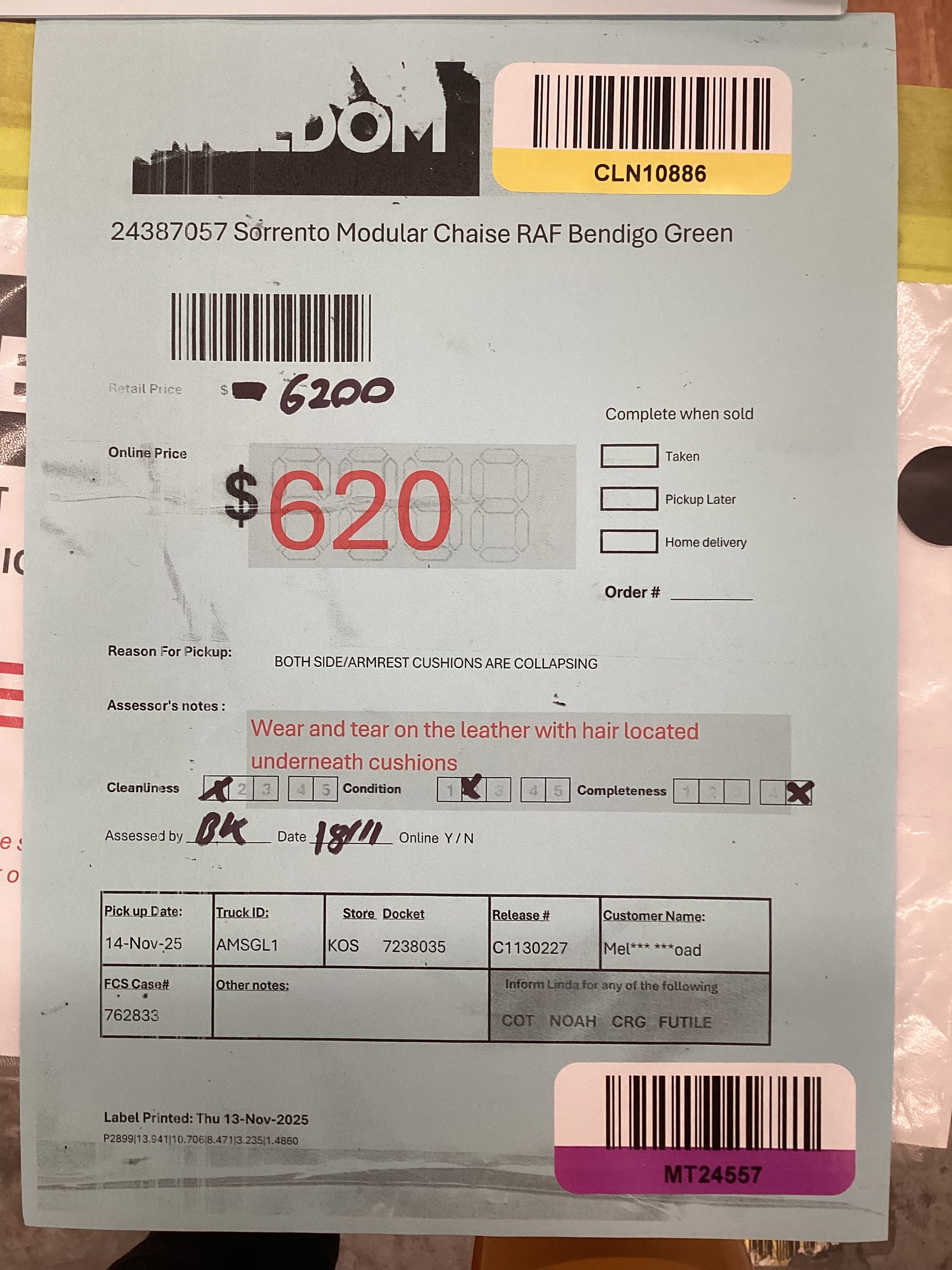 RETURN REASON:Â Both side and armrest cushions are collapsing