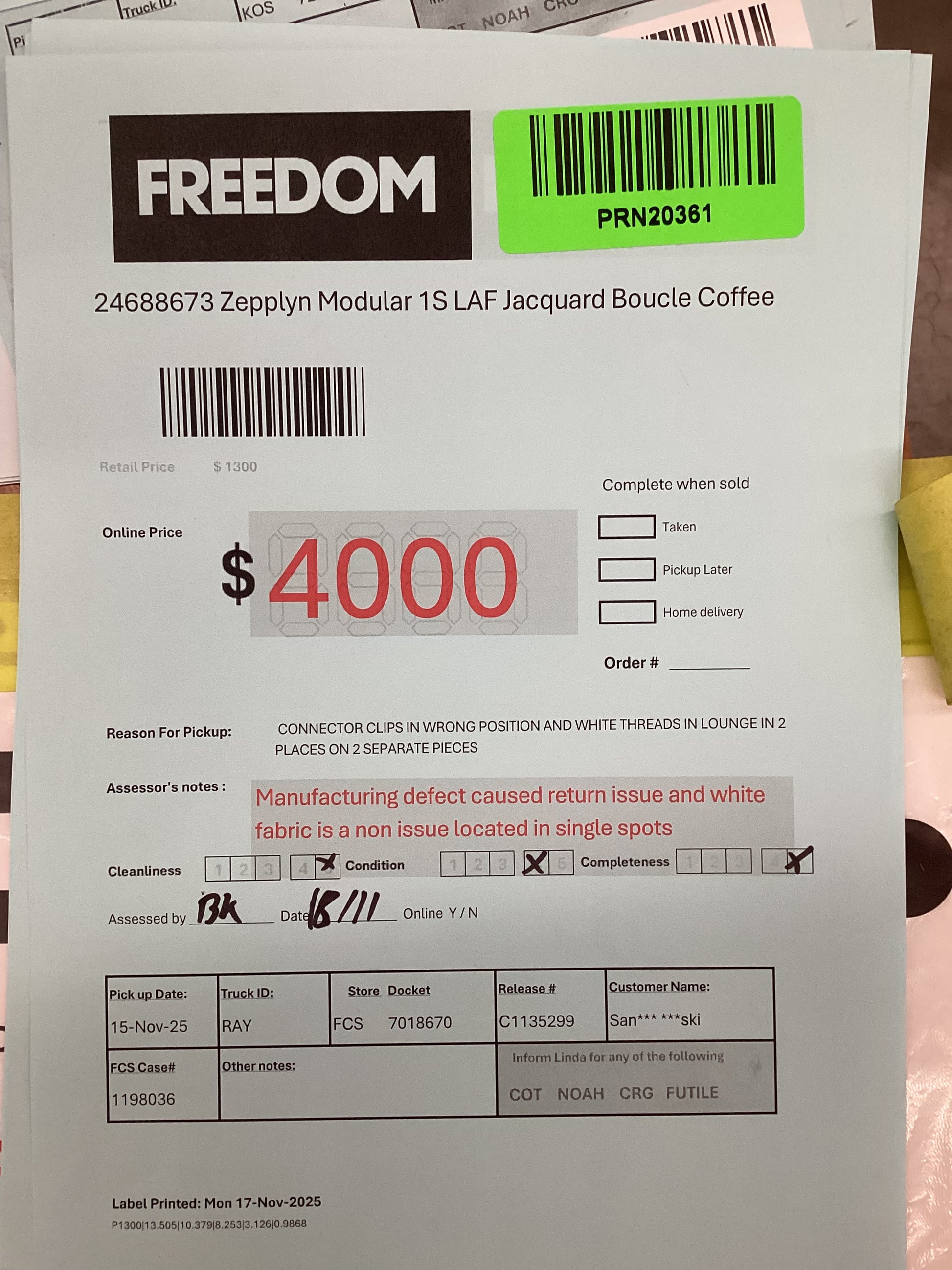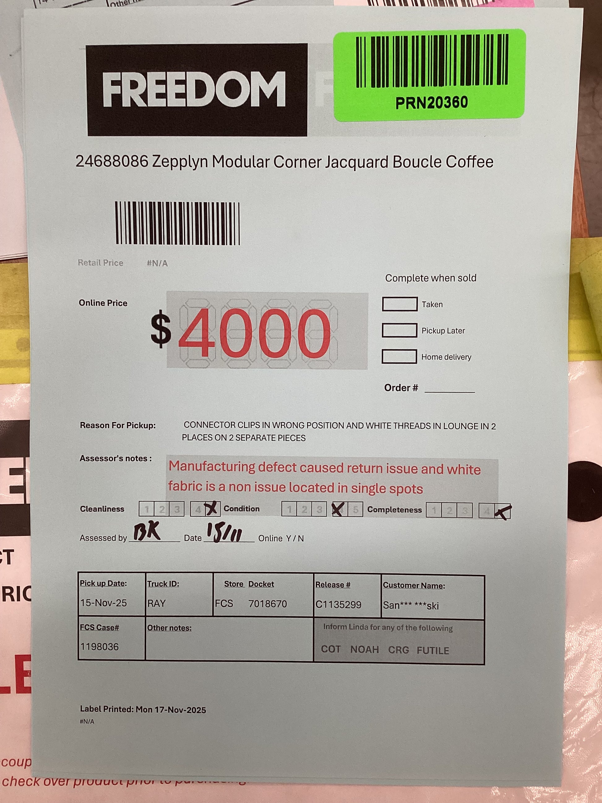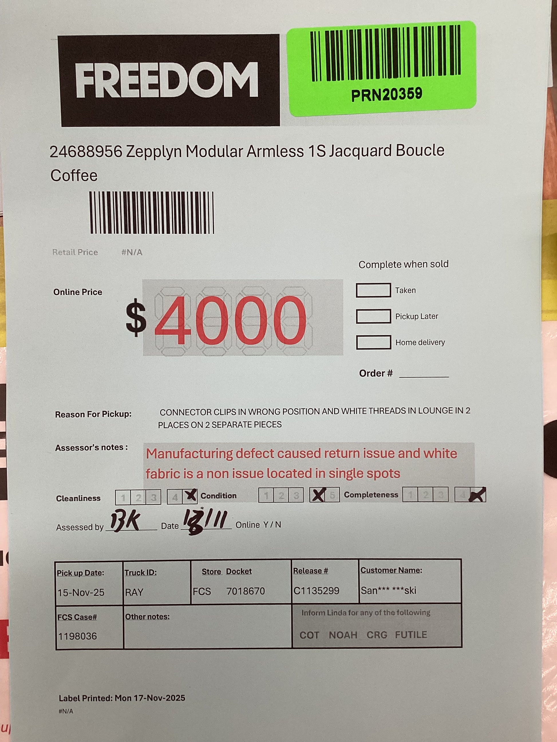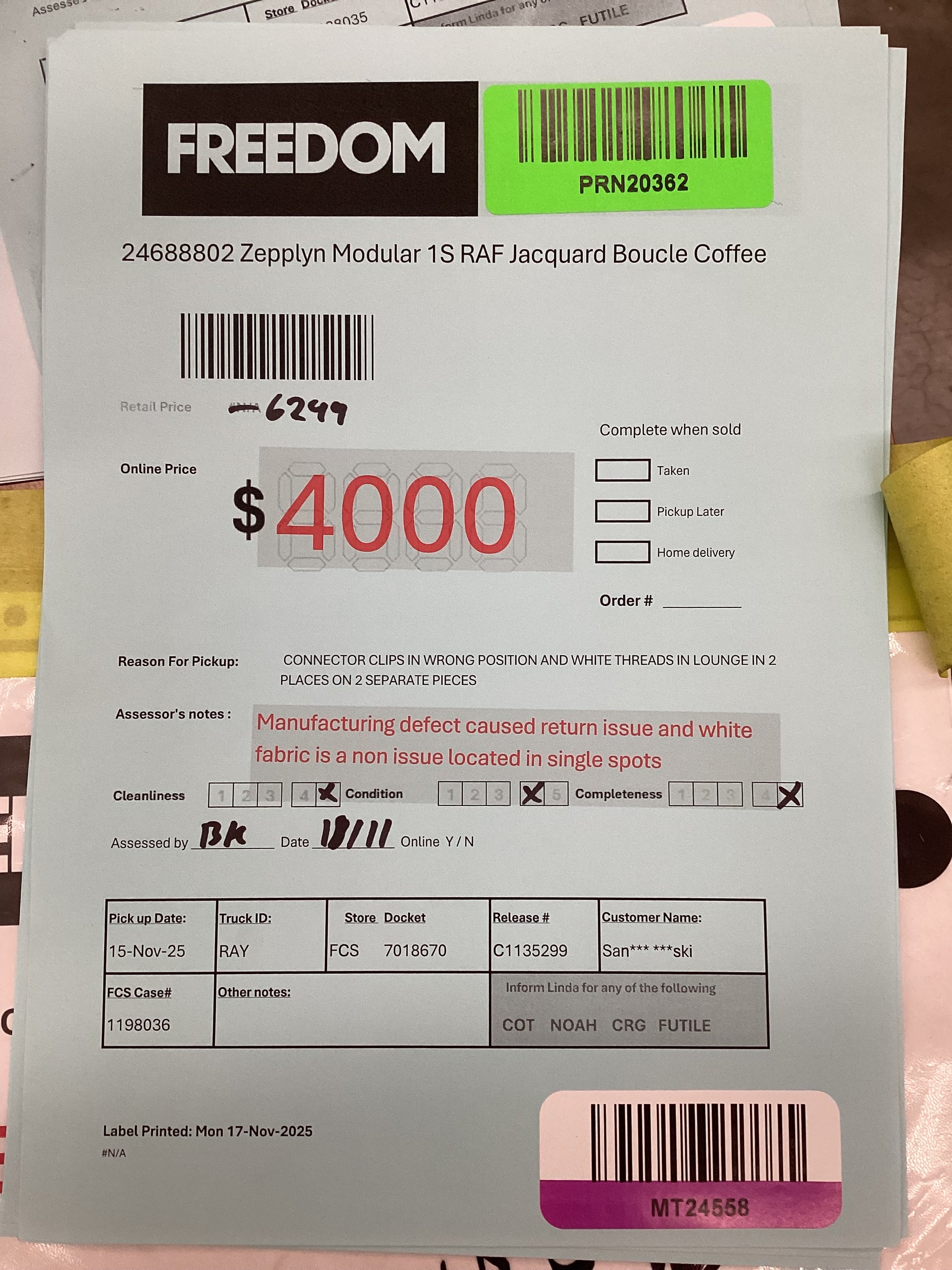 RETURN REASON:Â Connector clips in wrong position and white threads in lounge