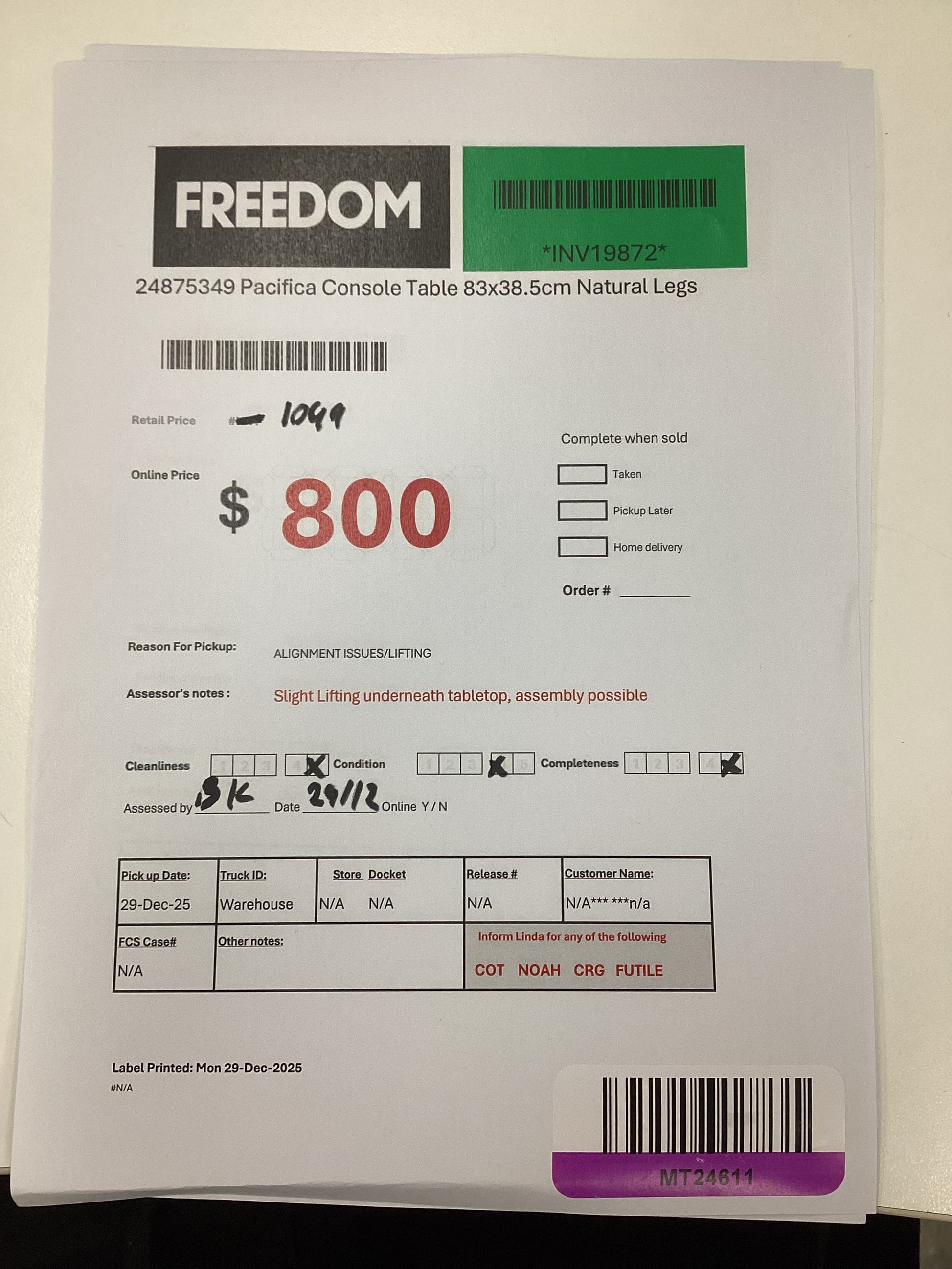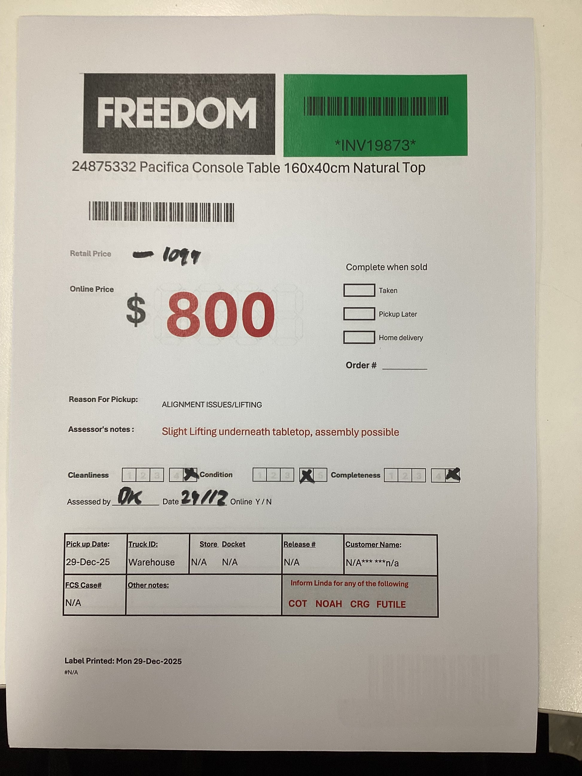 ASSESSOR NOTES:Â Slight lifting underneath tabletop, Assembly Possible