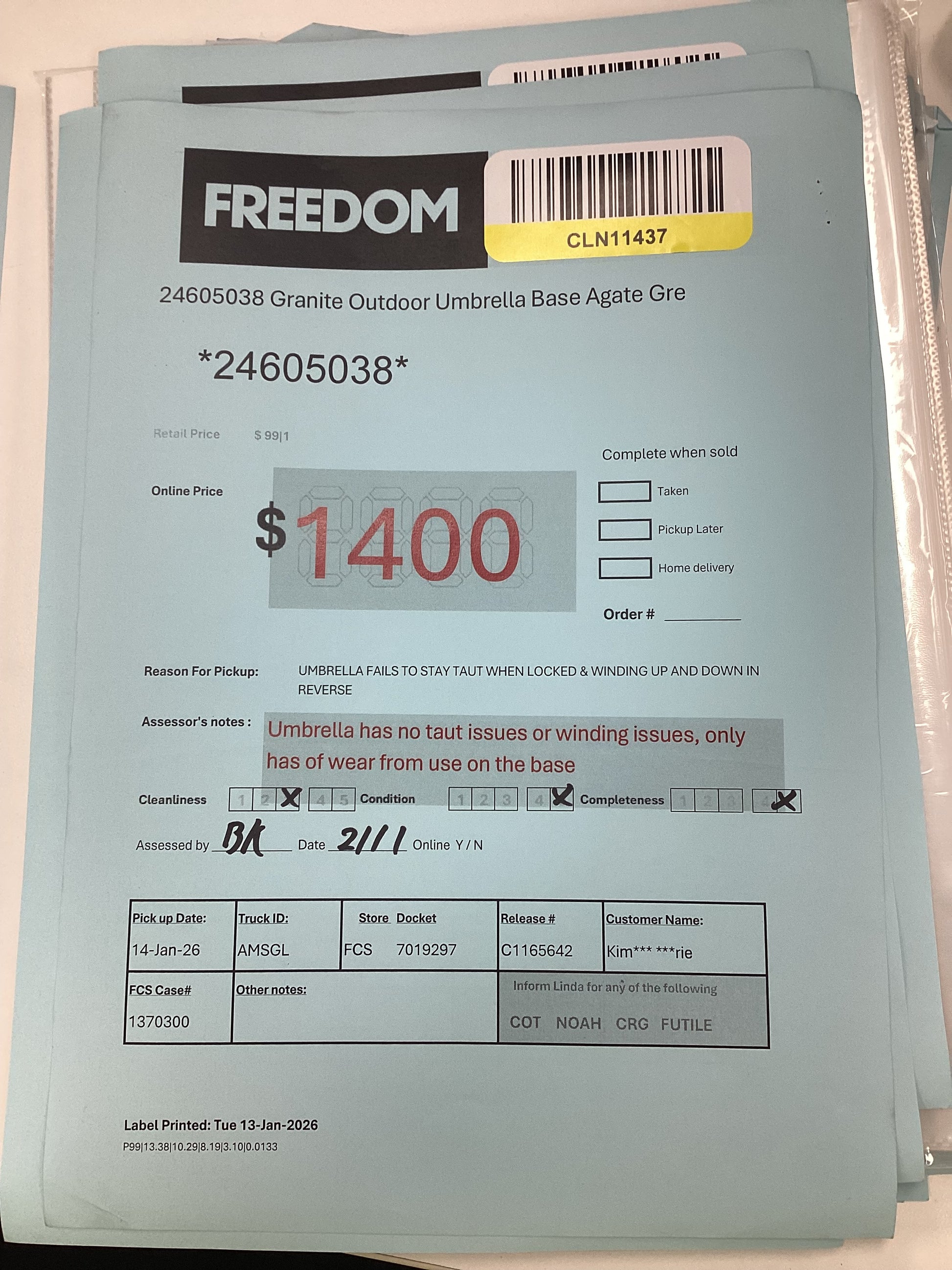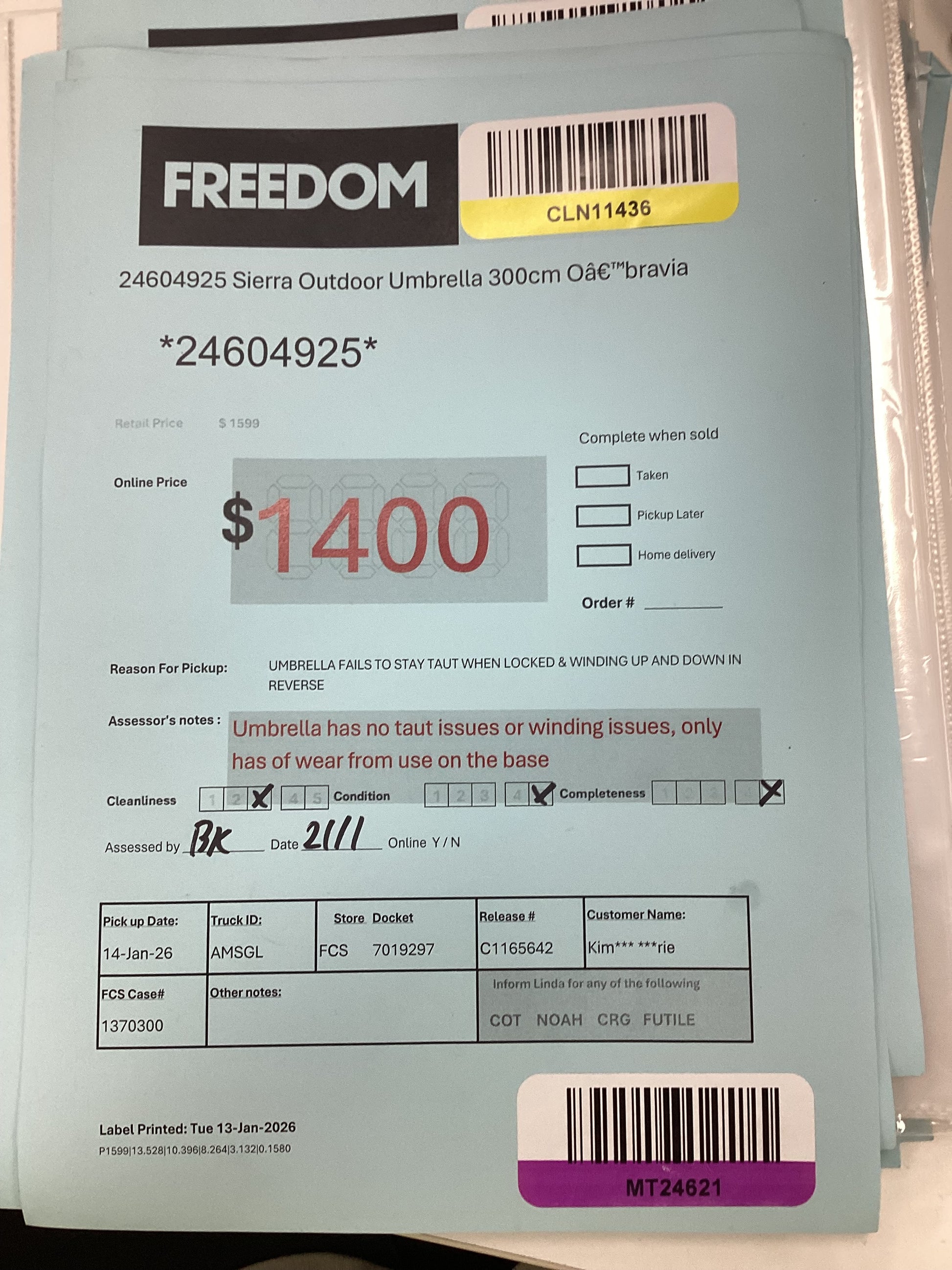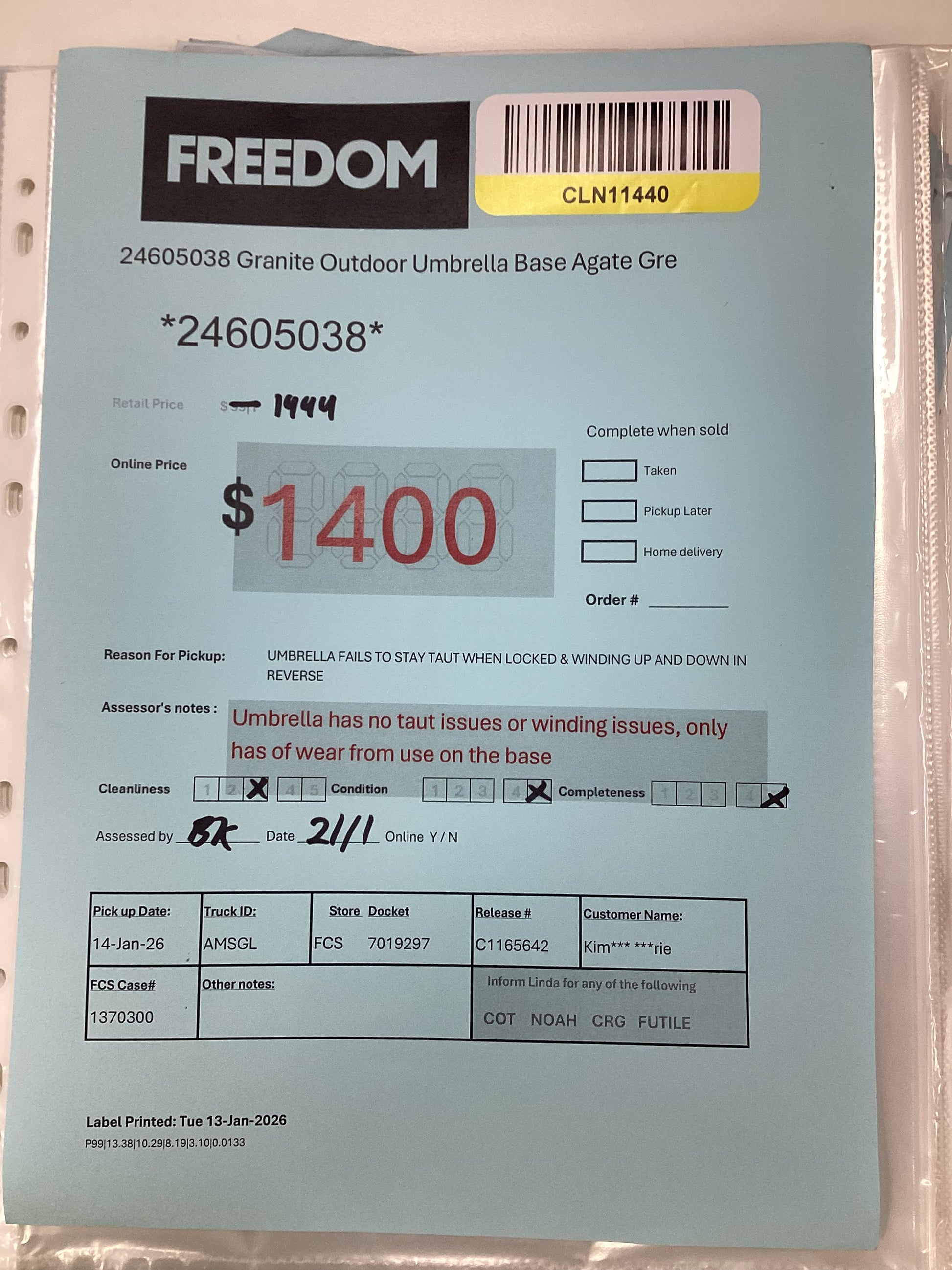 ASSESSOR NOTES: Umbrella has no taut issue or winding issue, only has wear from use on the base