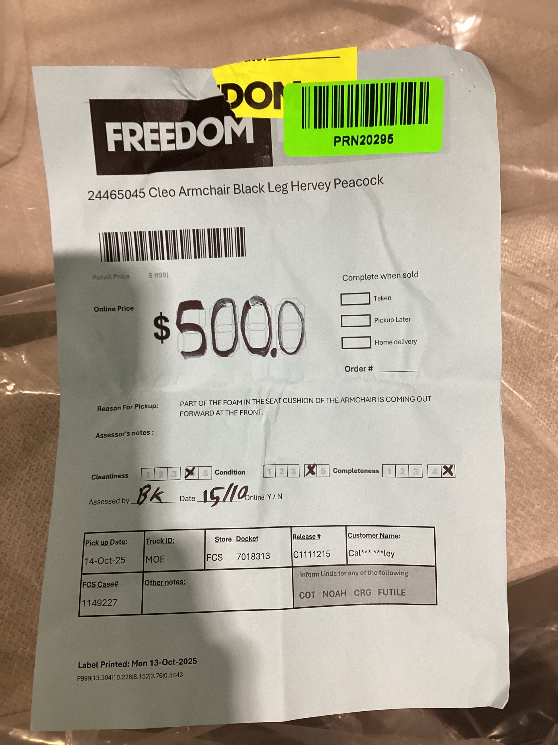 RETURN REASON:Â Part of the foam in the seat cushion of the armchair is coming out forward