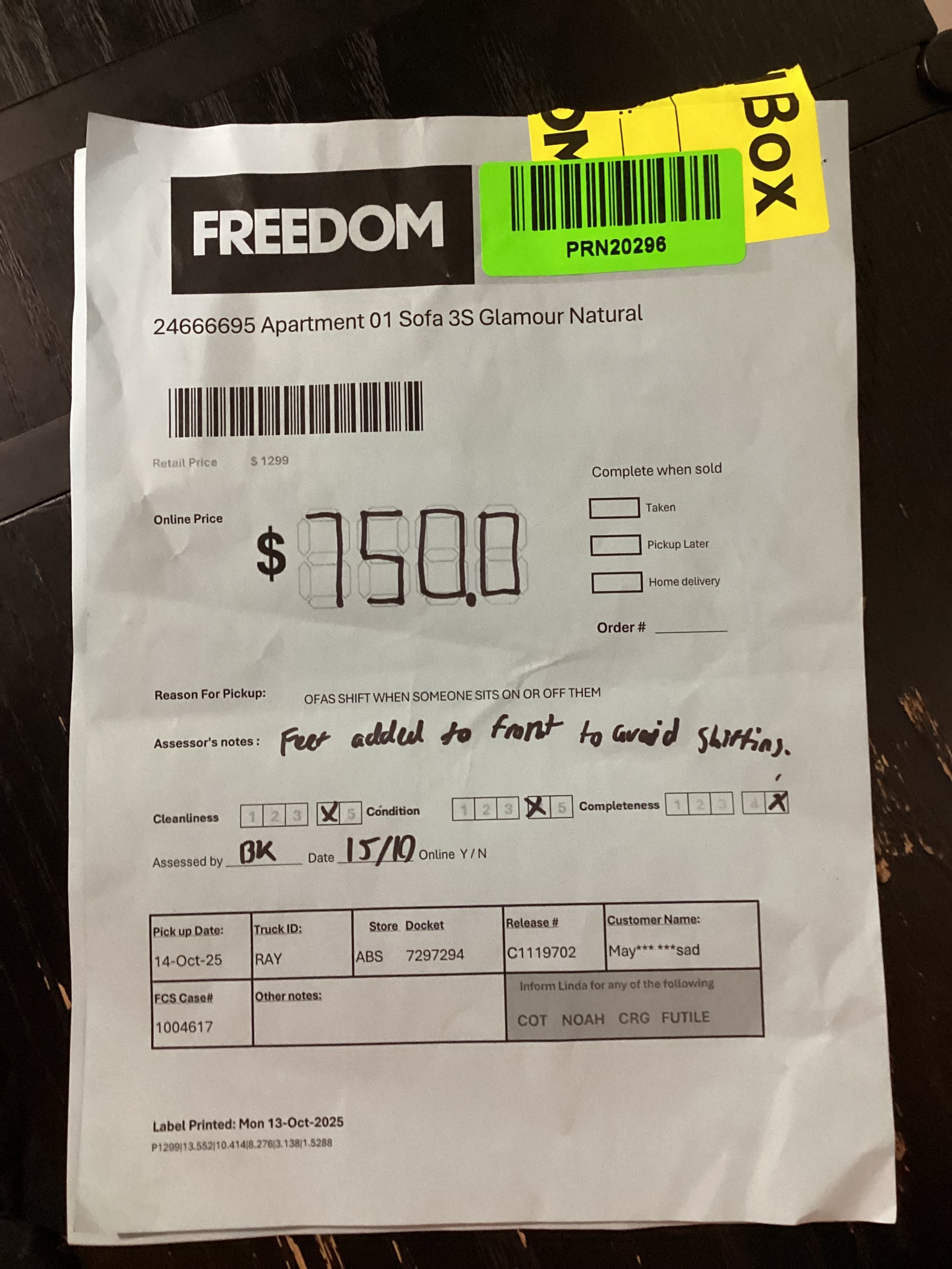 ASSESSOR NOTES: Added legs to front of sofa to avoid issue with shifting