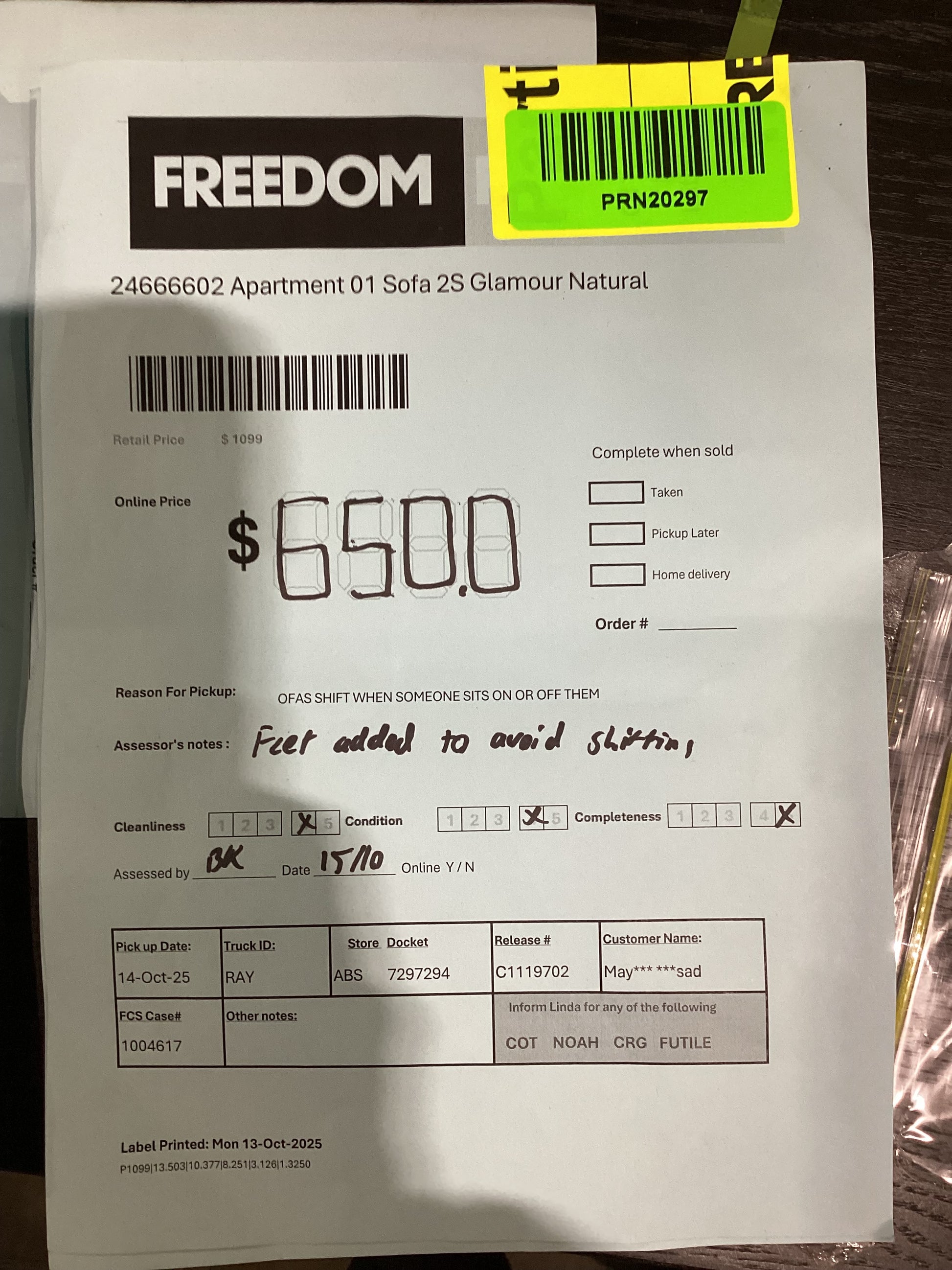 ASSESSOR NOTES: Feet added to front to avoid shifting