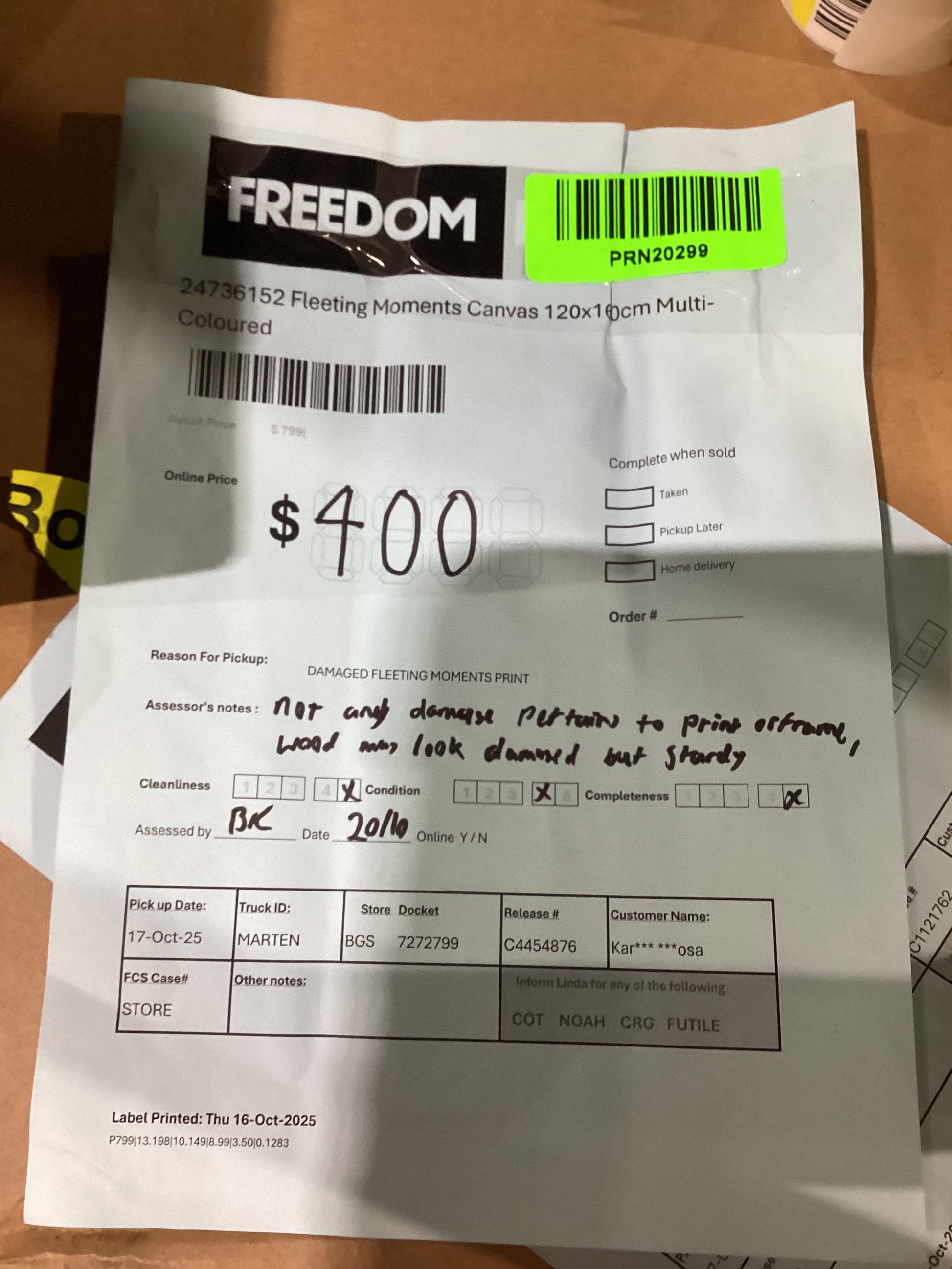 ASSESSOR NOTES: not any damage pertaining to print, frame looks damaged however still sturdy