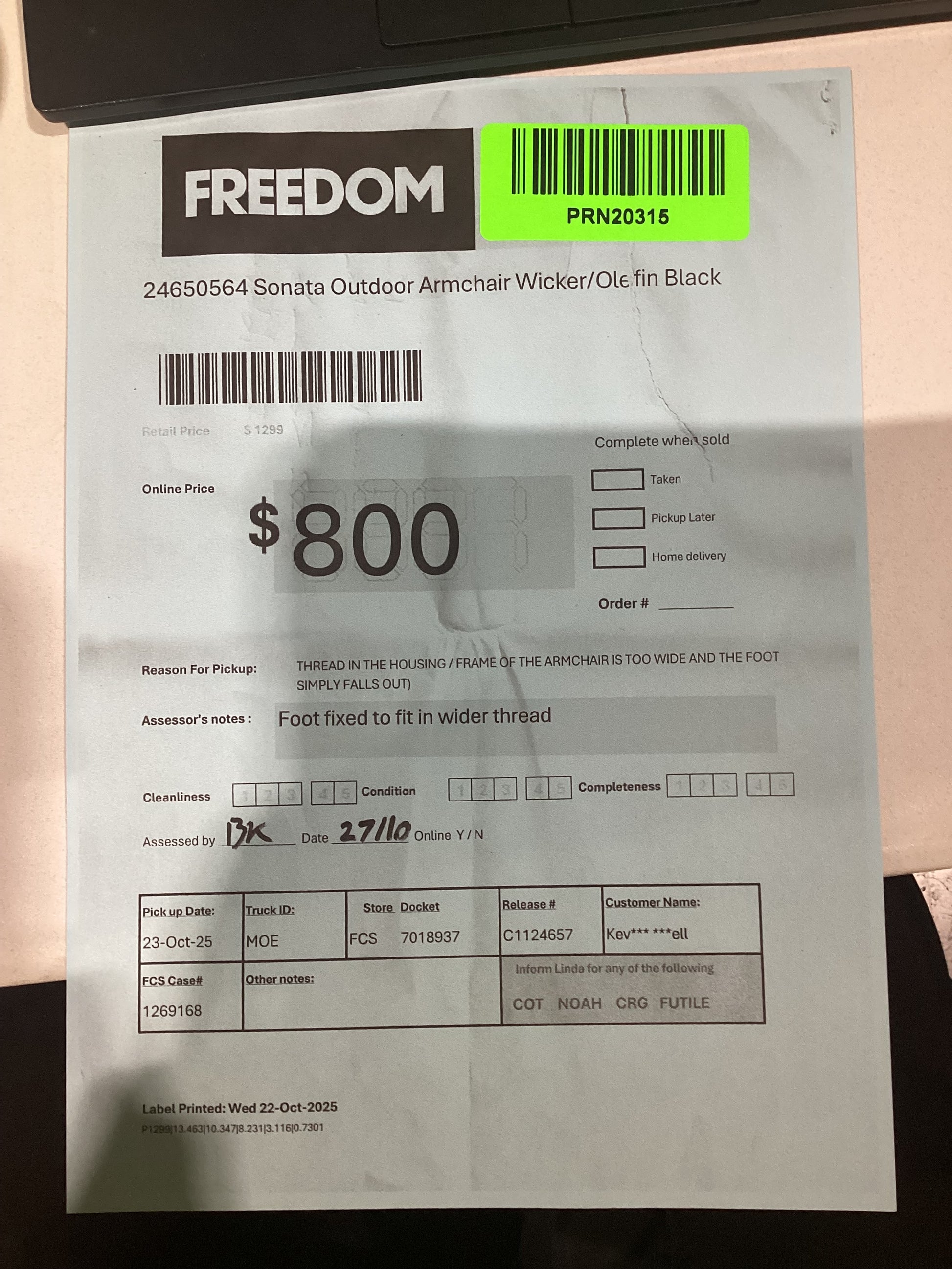 RETURN REASON:Â Thread in the frame of the armchair is too wide for foot screw