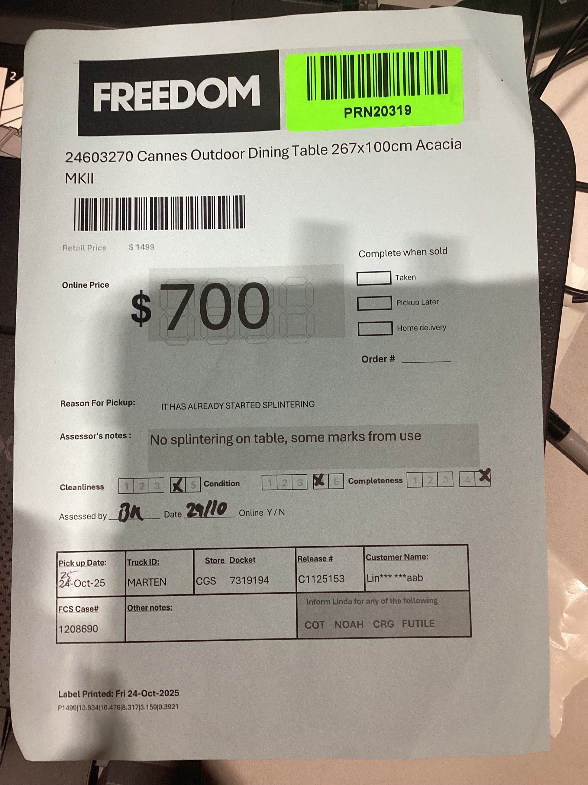 ASSESSOR NOTES: No splintering on table, some marks from use