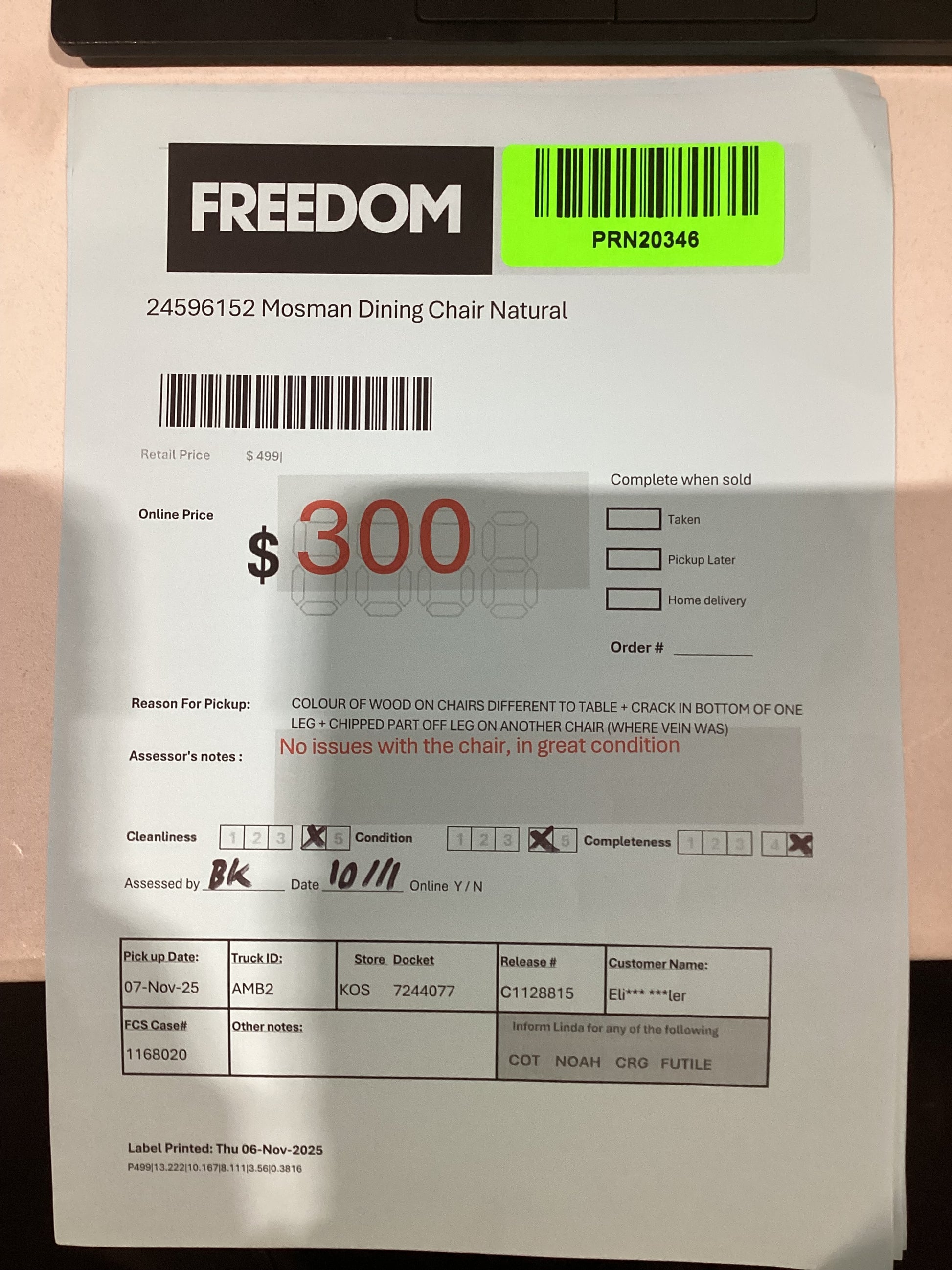 ASSESSOR NOTES: No Issues with chair, in great condition