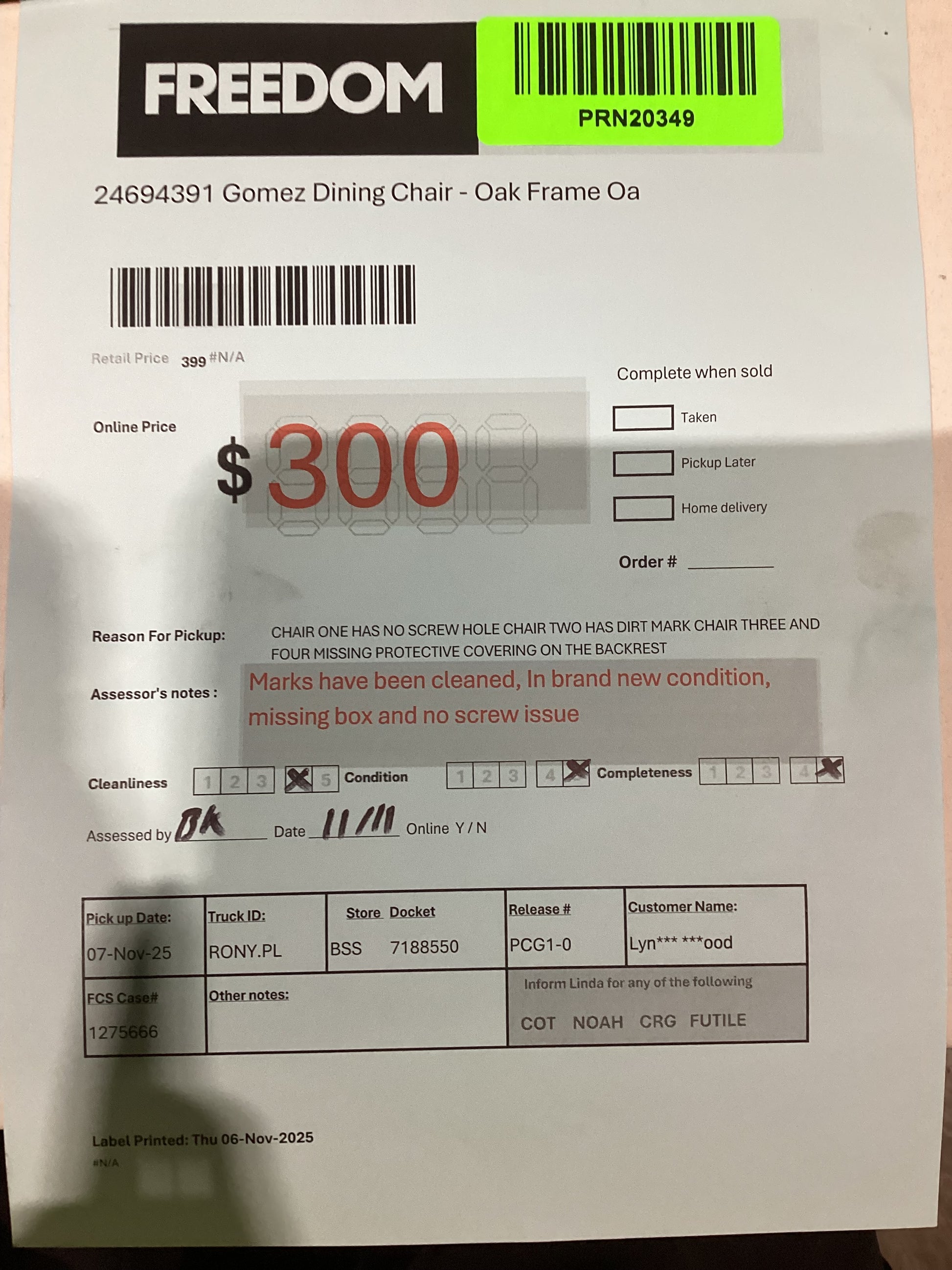 RETURN REASON:Â Chair one has no screw hole and other chairs have marks