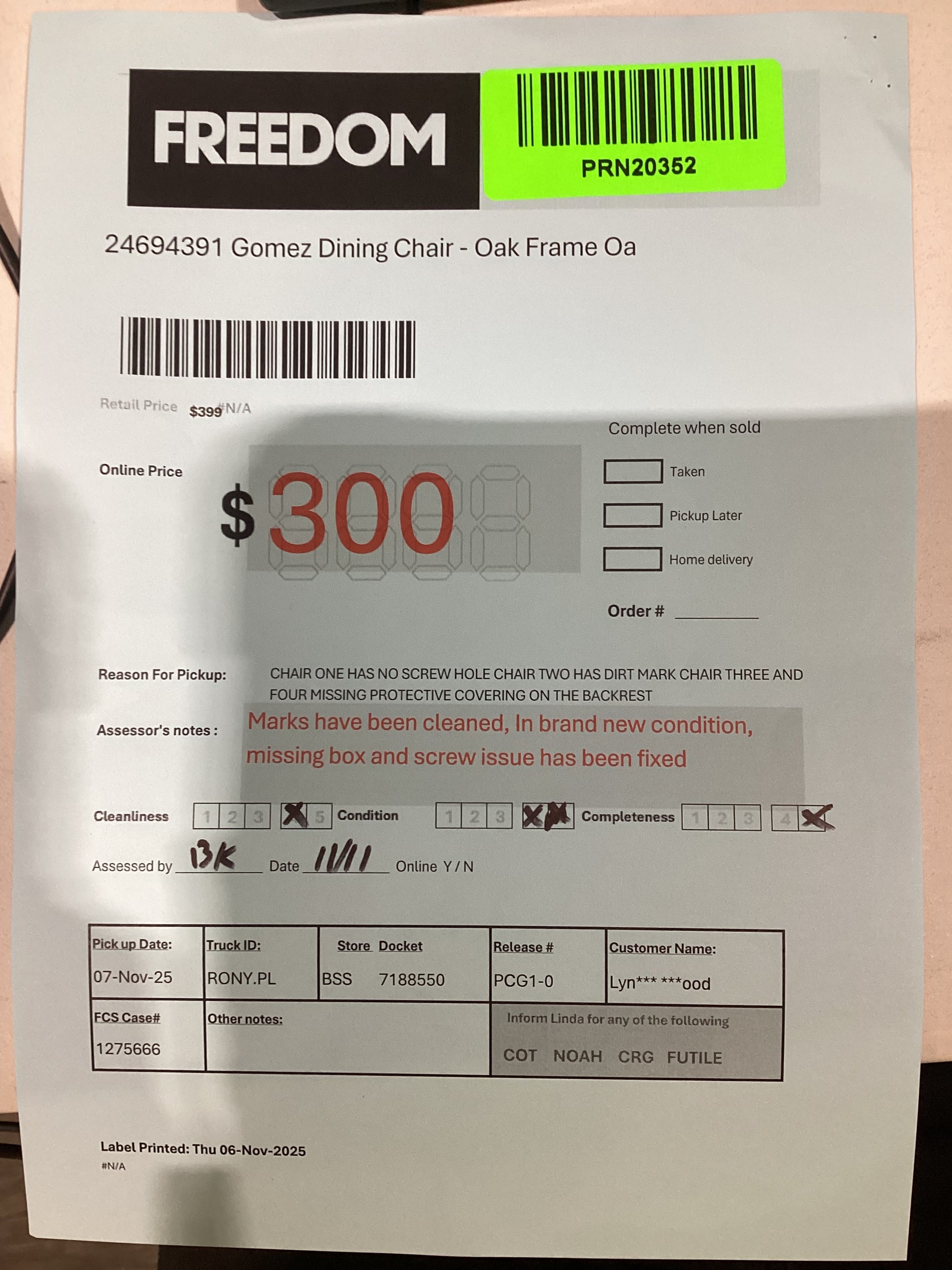 RETURN REASON:Â Chair one has no screw hole and other chairs have marks