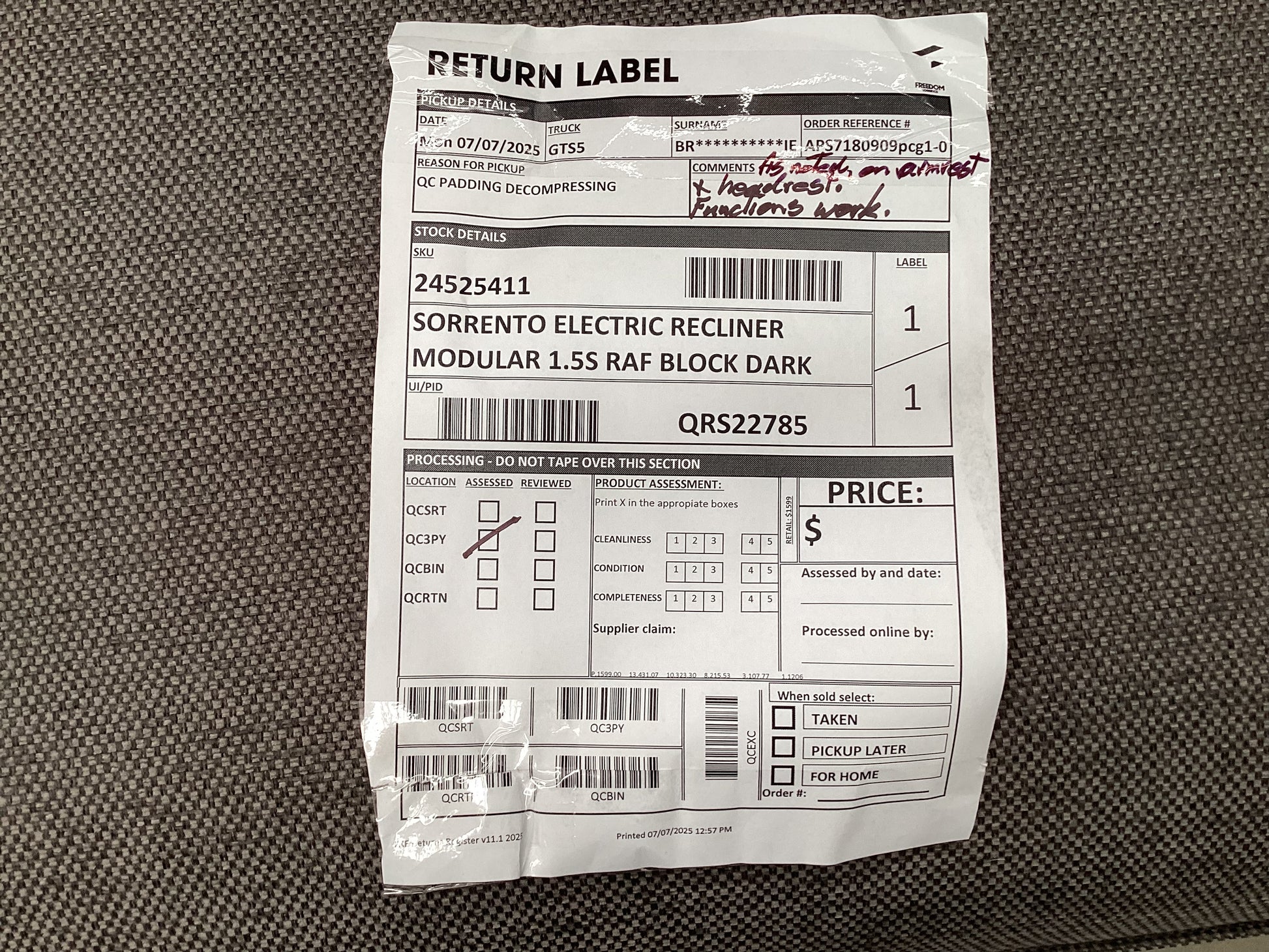 | QC Padding decompressing on armrests and headrests, recliner mechanism works fine. |